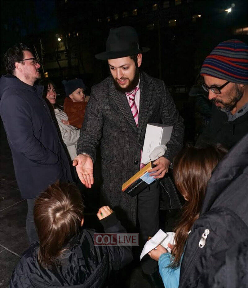 During the 8 day’s of Chanukah Rabbi Aaron L. Raskin and his family gather by the large Menorah for a lighting ceremony. Rabbi Raskin chooses one person to light the menorah with him and the crowd comes to enjoy hot latkes, prizes for children, menorahs, chocolates, and music given out by the Chabad crew. People coming out of the subways, tourists, locals and children gather around the grand menorah and all are in awe of the beauty and grace of the Chanukah lights as Rabbi Raskin recites the blessings and Torah messages through his microphone.