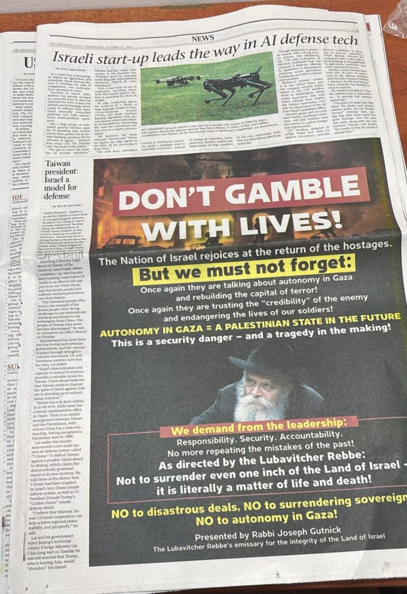 Under the slogan “Don’t Gamble With Lives!”, the campaign urges Israeli leaders to resist what Rabbi Gutnick describes as “a repetition of past mistakes — rebuilding the capital of terror and once again relying on the ‘credibility’ of the enemy, at the cost of soldiers’ lives.”