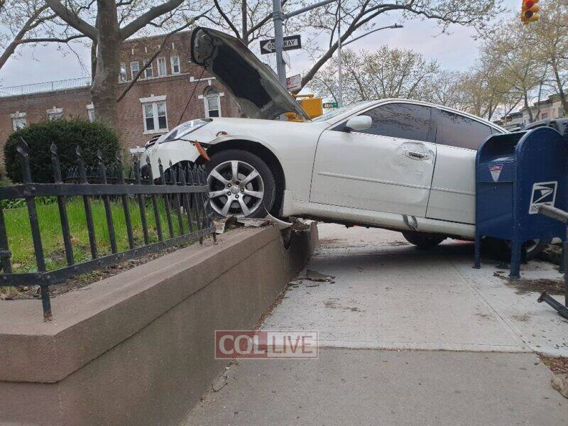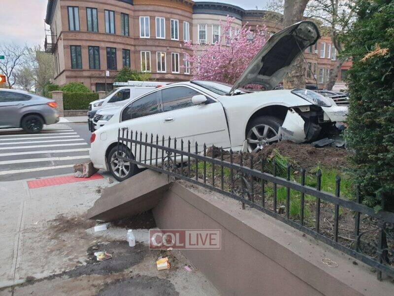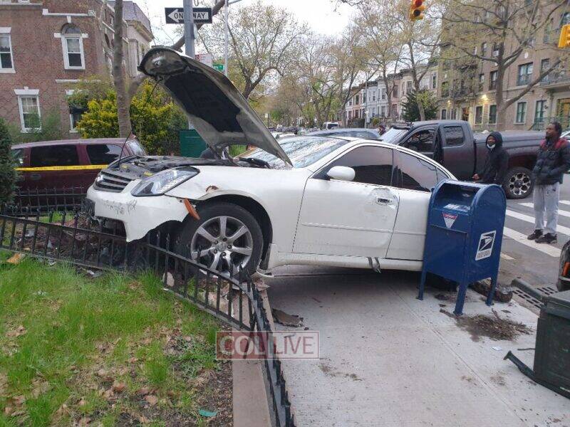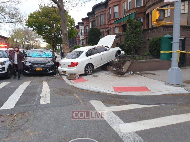 Watch: A driver of an Infiniti car drove up a wall of a residential home on the corner of President Street and Albany Avenue in Crown Heights on Wednesday. The driver hit a scooter driver along the way. Full Story, Video