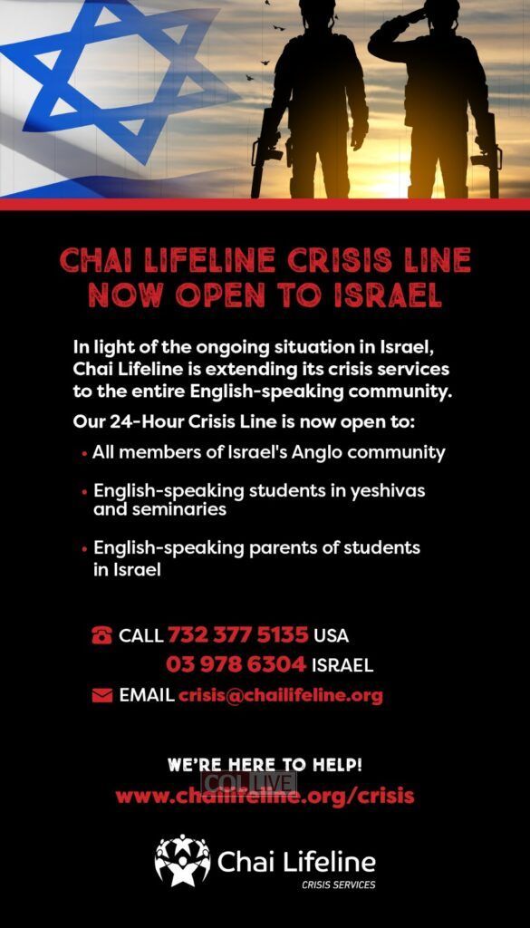 Chai Lifeline encourages anyone in those specified groups in need of support to contact its 24-hour, confidential crisis line at 732-377-5135 (US), 03 978 6304 (Israel), or email [email protected]. For anyone else in need, please contact 855-3-CRISIS.