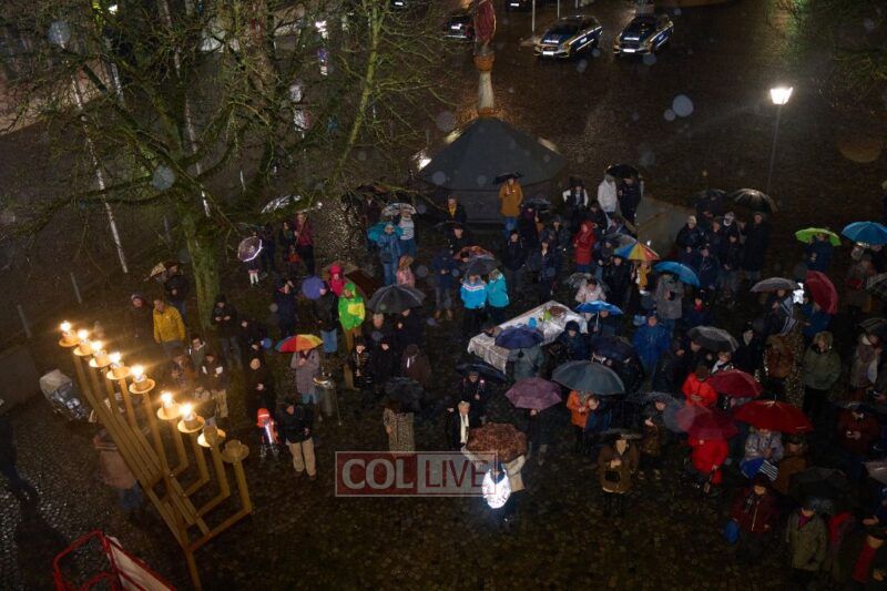 Another public Menorah lighting took place in front of the local Shul, despite pouring rain. Hundreds of local Jews, and many non-Jews as well, united in support of Israel at this event.