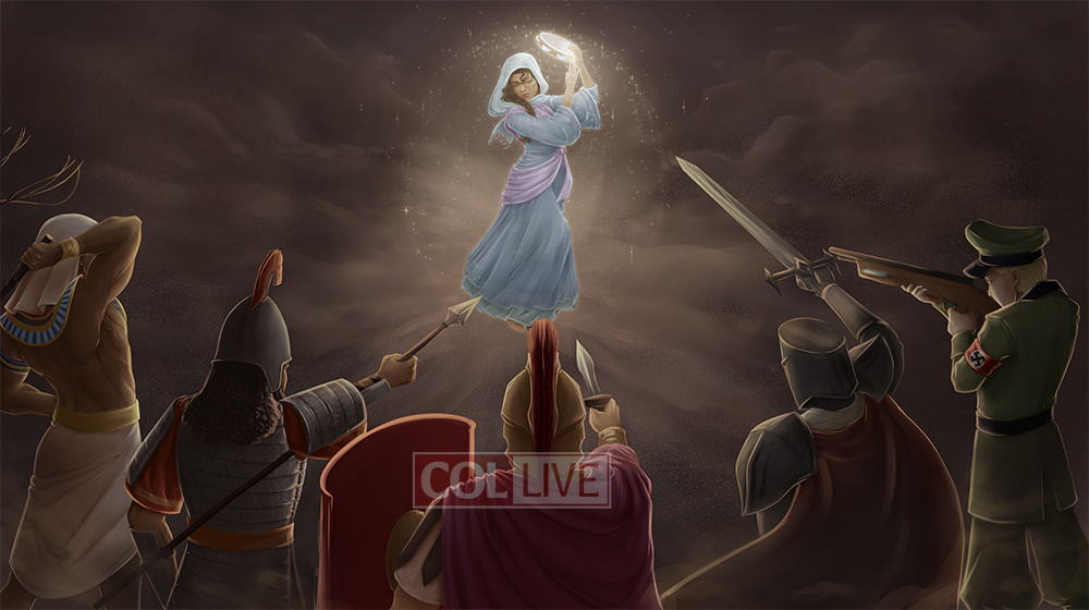 This piece is a combination of two different concepts in Chassidus: The fact that we have bitachon in Hashem that He will protect and redeem us is the very thing which ‘inspires’ Him to do so. In this artwork, the bitachon is represented by the tambourine, which is a symbol of the bitachon that the Jewish women had in Egypt; they had such firm belief that Hashem would redeem them that they prepared the literal instruments of their celebration. Therefore in this artwork the tambourine is giving off a protective aura over the Jewish woman, guarding her from those who would sought to destroy us throughout every generation. (Sicha, 2nd night of Pesach, 5721; Tanya, Igeres Hakodesh, siman 11; Sicha, Bo-Beshalach, 5752)