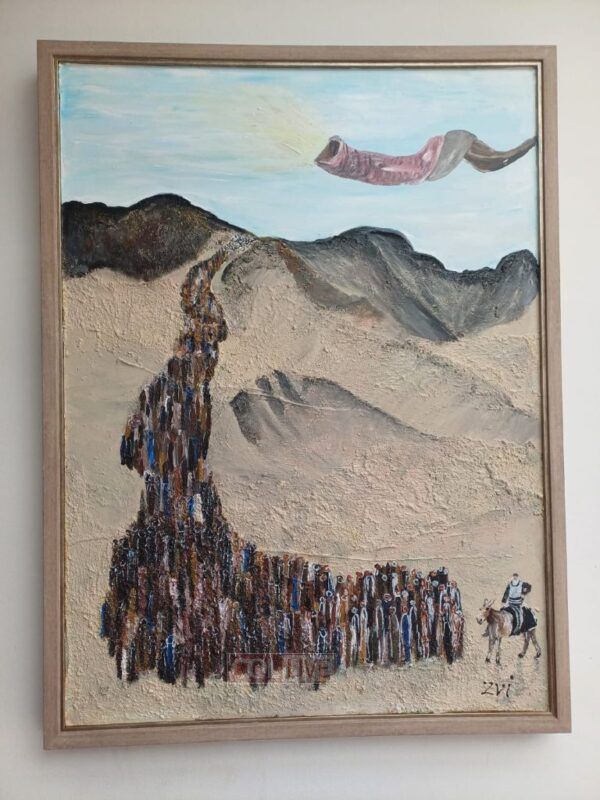 Concept: All the Yidden are united, greeting Moshiach on a donkey. We know that when Moshiach comes, all the Yidden will be together in achdus, and this painting conveys that unity as all the Yidden stand together in a bright scene that reflects the happiness they feel. The painting’s backdrop is a desert, symbolizing the desert of ruchniyus (spirituality) in which many Yidden sadly find themselves today. Moshiach, who has come, will illuminate what seems like a desert and bring out the beauty in every single one of Hashem’s creations. The light yellow coming from the shofar represents a spiritual sound that will awaken our hearts to complete teshuvah.