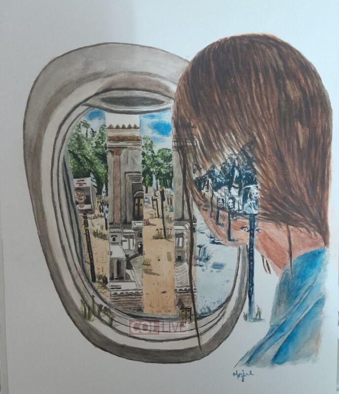 Throughout generations of suffering, Jews have been bringing the Geulah closer through acts of goodness and kindness during their darkest moments. We know there have always been special souls who rose above the chaos to live with a Geulah vision. However, today, any ordinary person can benefit from the merits of our previous generations. The Lubavitch Rebbe expanded on this concept, explaining that we can all simply open our eyes and adopt a Geulah mindset and vision. My watercolor painting depicts an ordinary modern woman on a flight, peering into the Nova abyss while refocusing her mindset on the Beis Hamikdash and Geulah vision. She envisions the return of all the hostages along with the immediate rebuilding of the Beis Hamikdash, speedily in her days. Amein! (Sefer HaSichos נב volume 1. פרשת וישלח p165 and מוצאי י”ט- כ”ה כסלו where the Lubavitch Rebbe explains the concept of ‘opening our eyes with גאולה Vision’.)