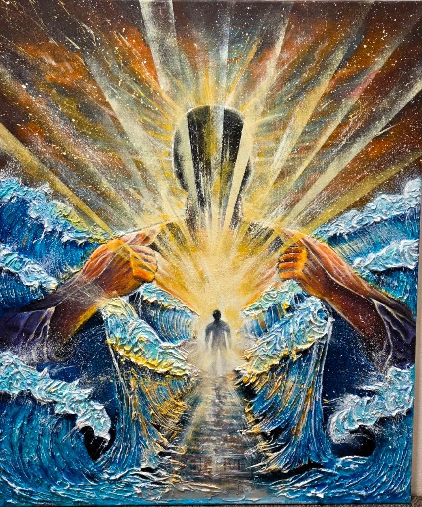 In the painting, the figure represents that רגע of awakening—when a person begins to recognize that they are not defined by those limitations. The splitting of the sea becomes a visual language for this shift, where what was hidden beneath the surface is suddenly revealed. The light emerging from within the figure reflects the idea that geulah doesn’t begin from the outside, but from an inner clarity that was always there.