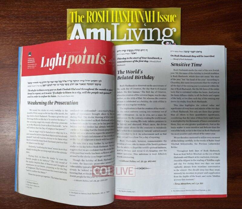 This Yom Tov, the book’s appearance in the magazine packages is expanding. With a Lightpoints-taster being featured in the U.S. editions of Ami, Mishpacha, and Hamodia, as well as the Israel editions of Mishpacha and Hamodia, over 200,000 Yidden will be receiving and absorbing the Rebbe’s Torah this Rosh Hashanah.