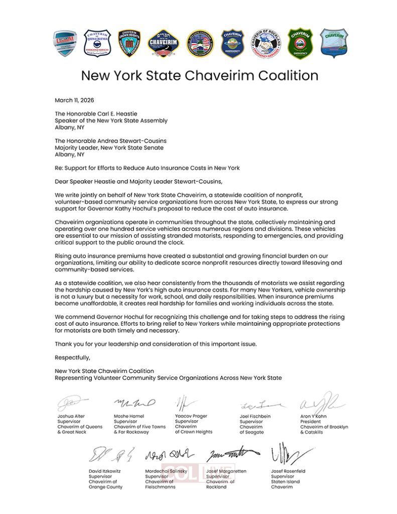 In a joint letter sent today, the New York State Chaveirim Coalition expressed strong support for a proposal by Kathy Hochul aimed at lowering auto insurance premiums for drivers statewide. The letter was addressed to Carl E. Heastie and Andrea Stewart-Cousins.