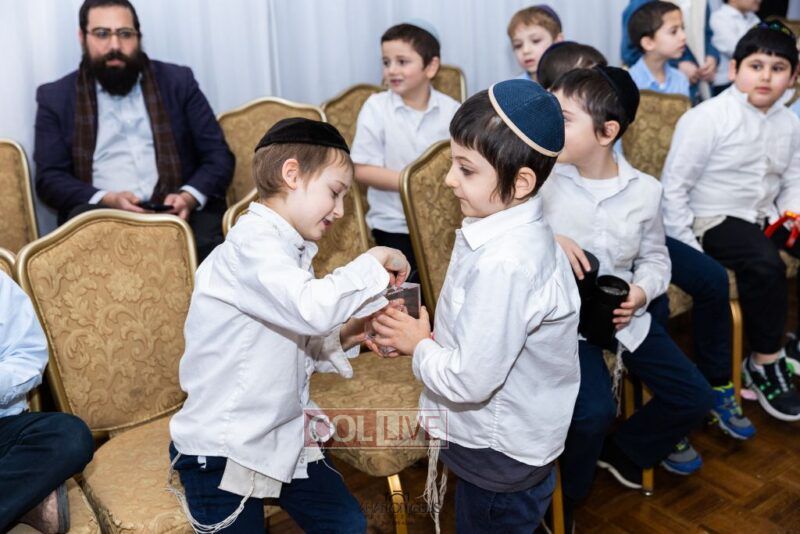 Rabbi Simpson, teacher at the Cheder, then called up students from both schools for the 12 Pesukim, with Torah, Tefillah, and Tzedakah.