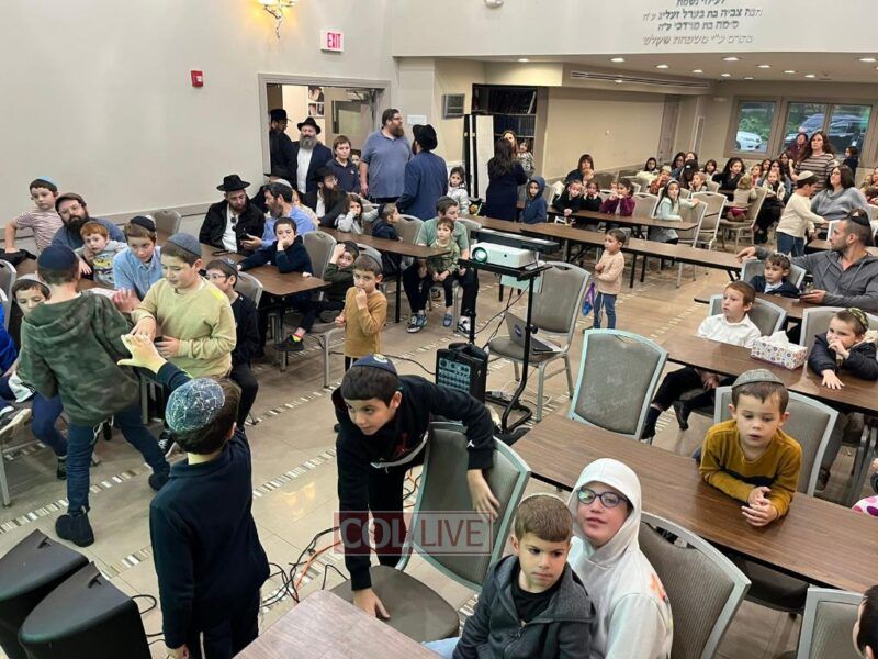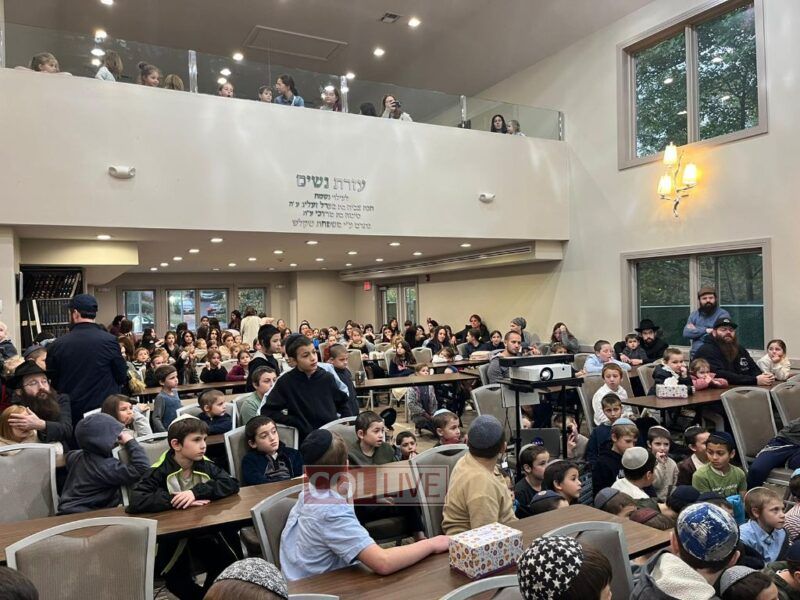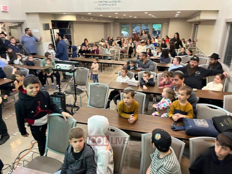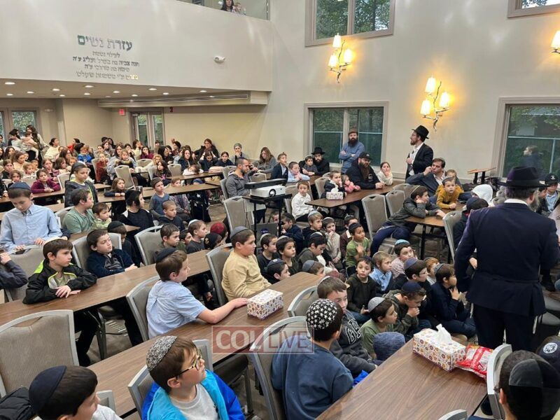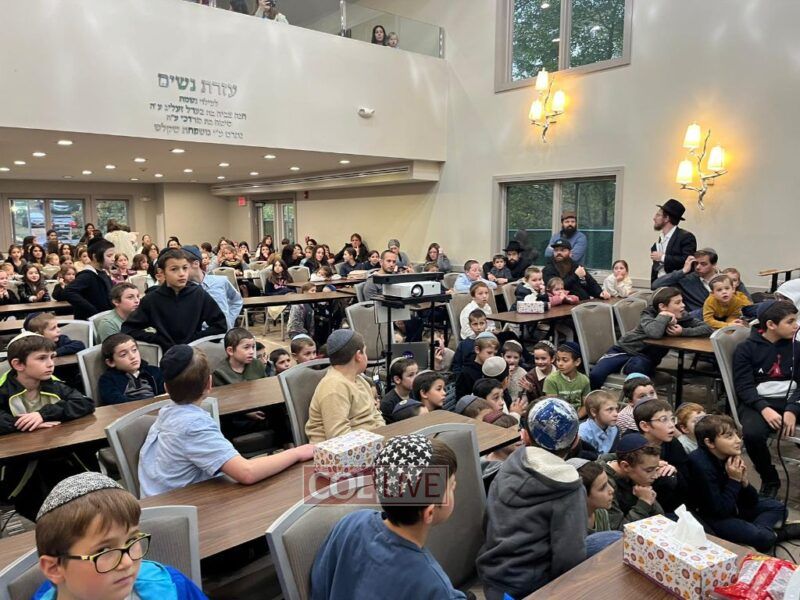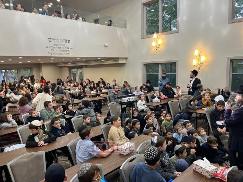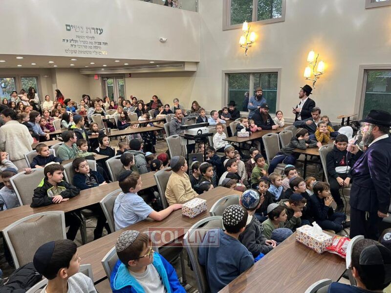 R. Yechiel Krisch, the organizer of the event, and Magid Shiur in the community, and R. Yisroel Silverstein, a veteran MeChanech and Magid Shiur in the community, led the children in Psukim, Tehillim, and further words of inspiration. As the children filed out of the shul, they each received candies and enjoyed a pizza dinner generously donated by Pies N’ Fries.