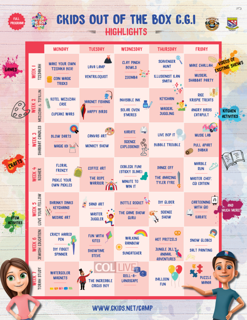 Baking, Zumba, art, scavenger hunts. All the iconic CGI activities are done by the children at home or in socially distant settings. “Just because their plans were upended, they shouldn’t have to miss out,” says Rabbi Mendel Raskin, director of Out of The Box CGI. They even get to participate in a Shabbos party and bake challah on Fridays. The day ends off with a presentation by a professional entertainer like an illusionist show or a talent lesson.