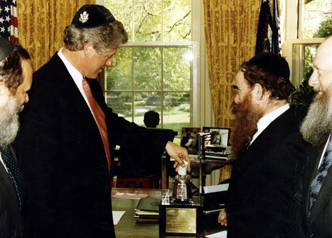 “On Bill Clinton’s 100th day, he was photographed with the king of Spain, and some Lubavitcher rabbis dropped by to present him with a skullcap inscribed with his name, in Hebrew and English,” the Times wrote.