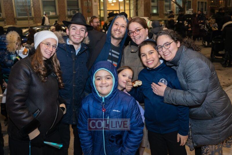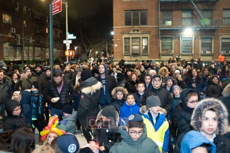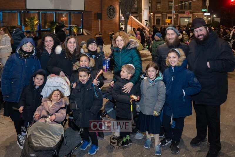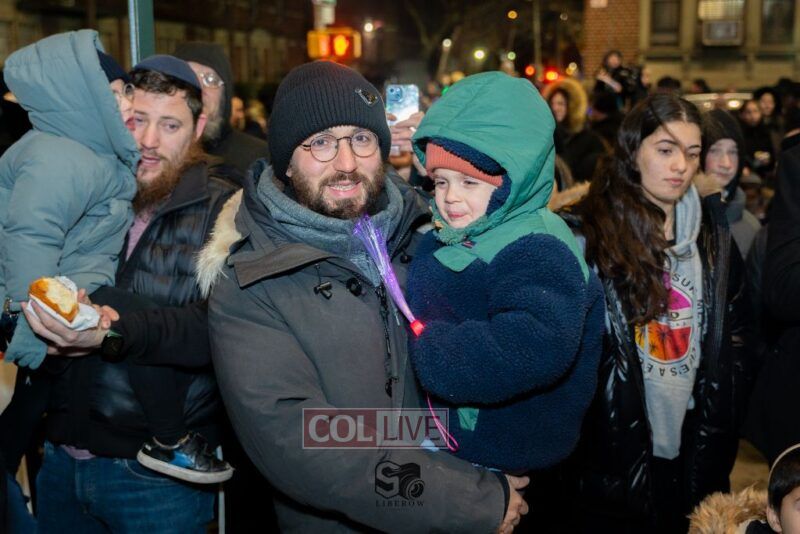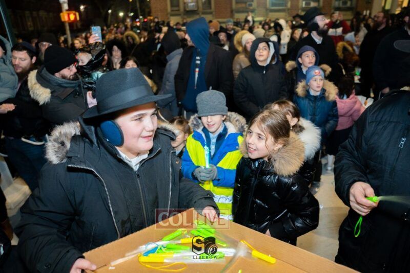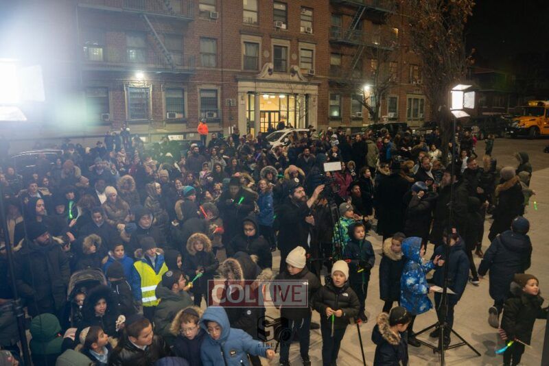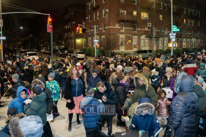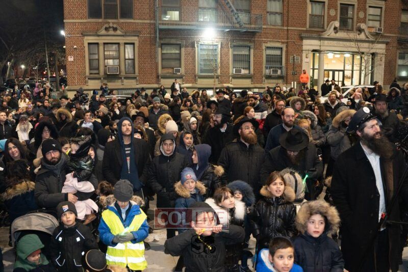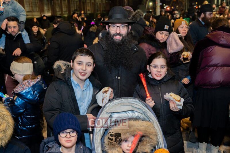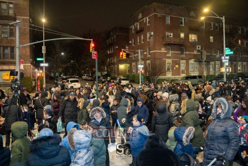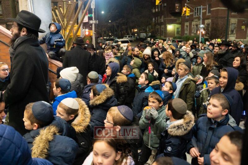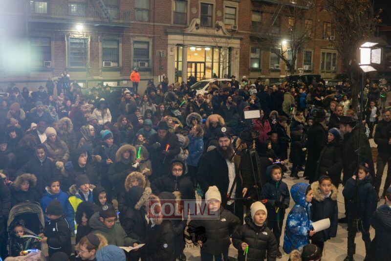 Hundreds joined a grand community-wide achdus Menorah Lighting event Thursday night, the first night of Chanukah, on Tomchei Temimim Way, hosted by Lubavitch Yeshiva in Crown Heights.