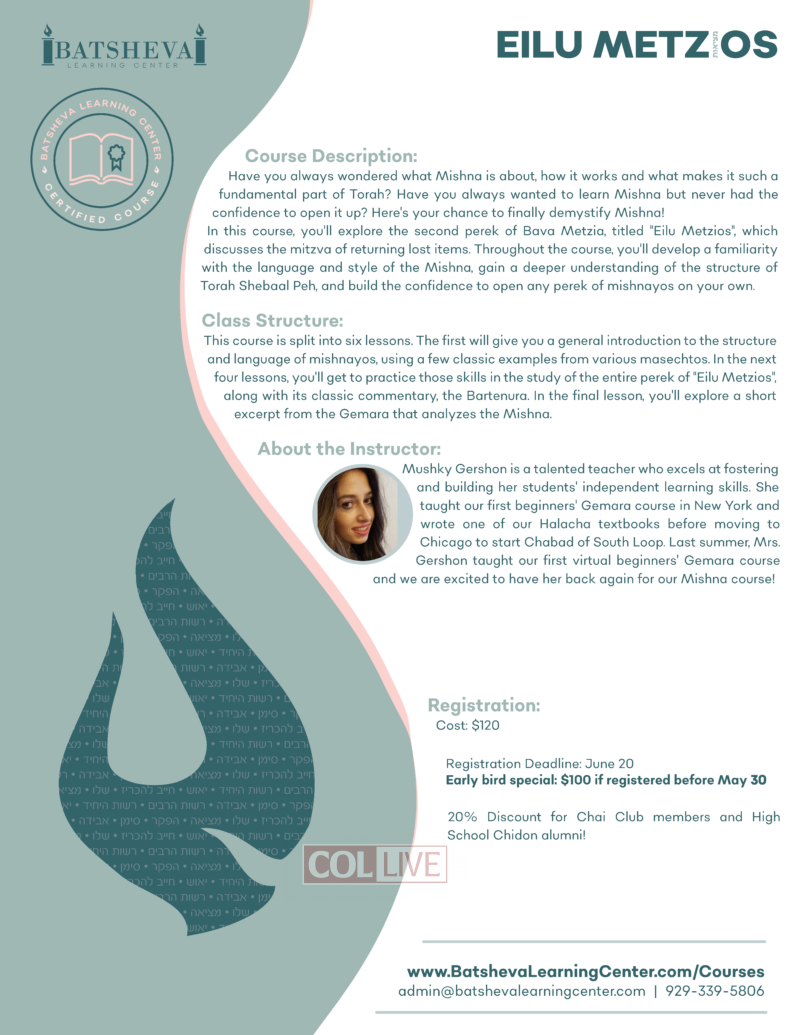 A brand new course offered by Batsheva Learning Center this summer aims to change that. The course is an opportunity for women to demystify Mishna and gain a familiarity with its language and style, so that they can feel comfortable and confident with opening up a sefer of mishnayos on their own. It gives mothers the tools to be able to learn with their sons as they grow up and be part of their education at every stage of their lives.