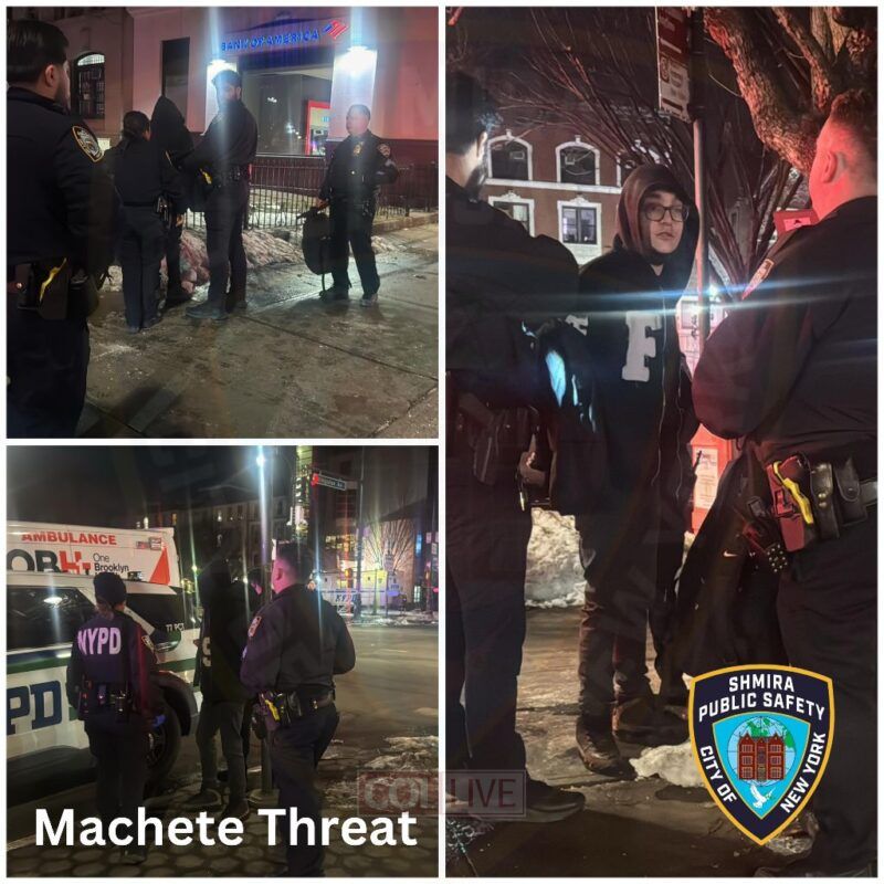 Machete Threat: A suspect brandishing a machete was arrested near Kingston Avenue and Lincoln Place on February 16 at approximately 10:00 PM following a rapid response by Crown Heights Shmira and the NYPD.