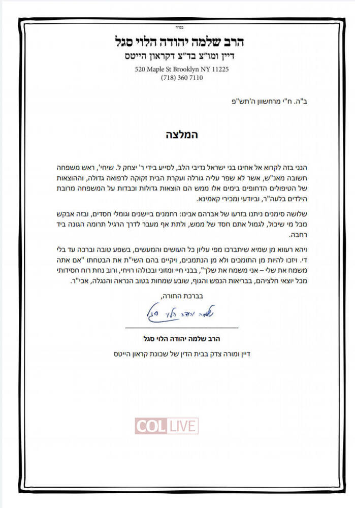 Campaign endorsed by Rabbi Shlomo Segal of Crown Heights Beis Din.
