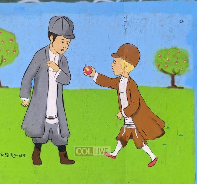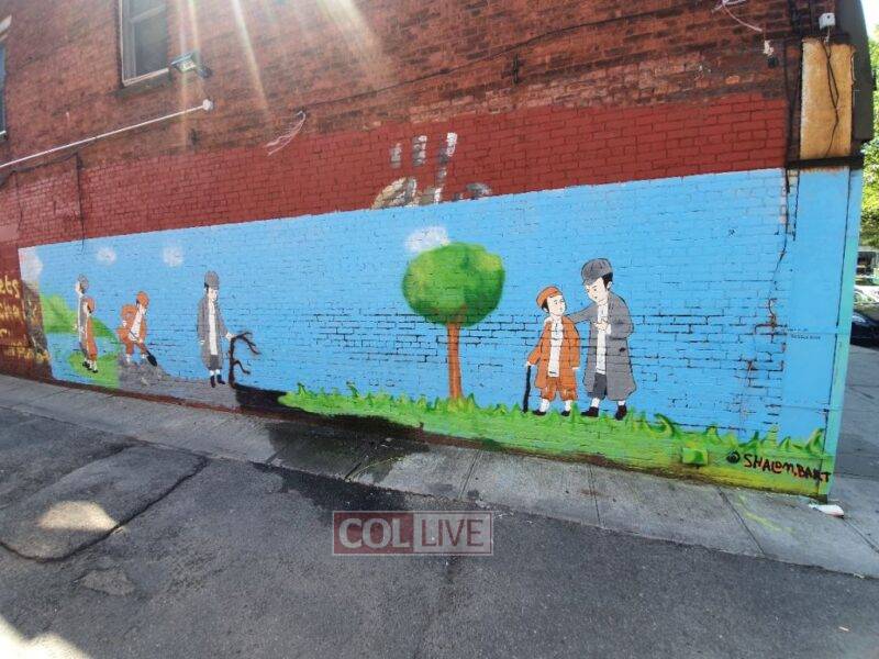 Artist Shalom Ber Burkis created this colorful street art of Chassidim traveling to the Rebbe while being transported spiritually as well.