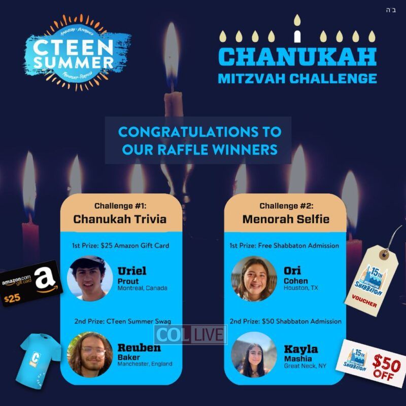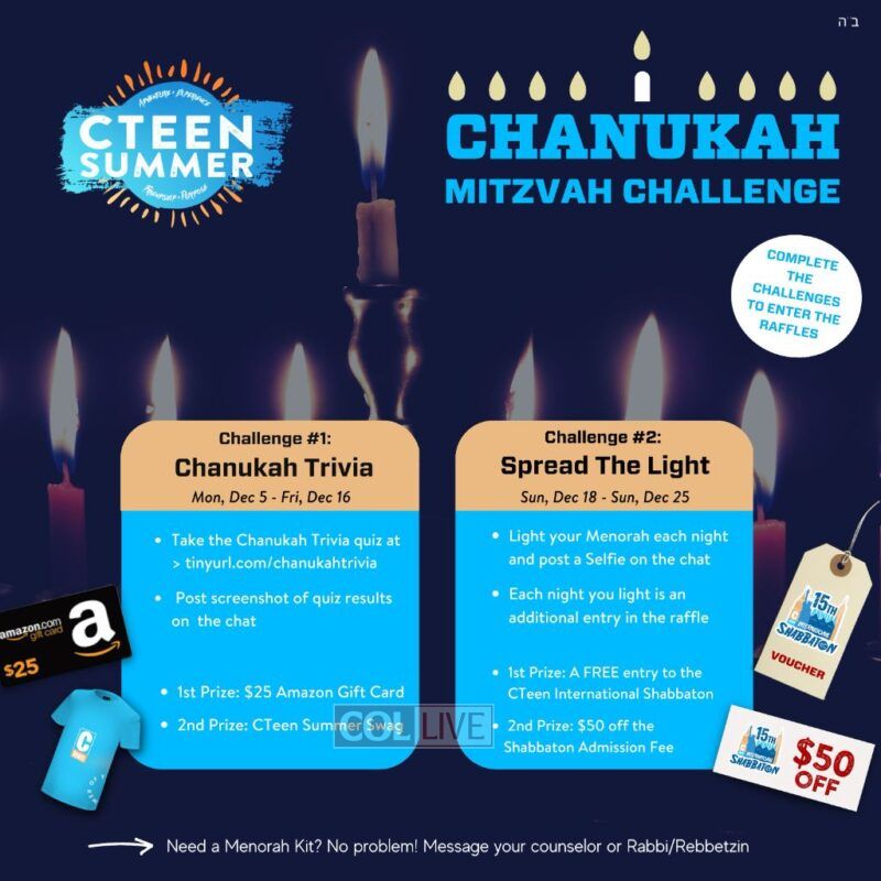 This month’s challenge gave CTeen Summer alumni the opportunity to learn about Chanukah through an interactive online quiz and connect with other teens by encouraging them to share menorah-lighting selfies on their ongoing camp WhatsApp groups. Both parts were a success. But this challenge came with an unexpected bonus: “The teens took this to another level and proudly displayed their menorah selfies across social media. The teenagers were excited to share their Judaism on their personal accounts, a space the average teen is pretty selective about,” shares Mendy Lepkivker, program coordinator, “in effect, they were lighting up the world.”