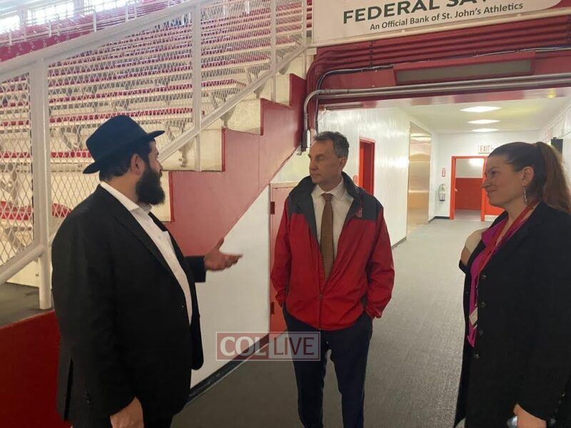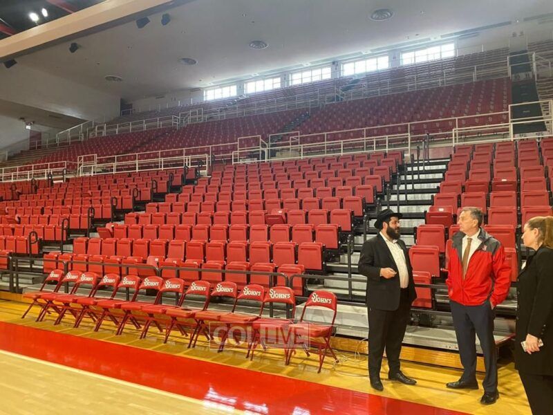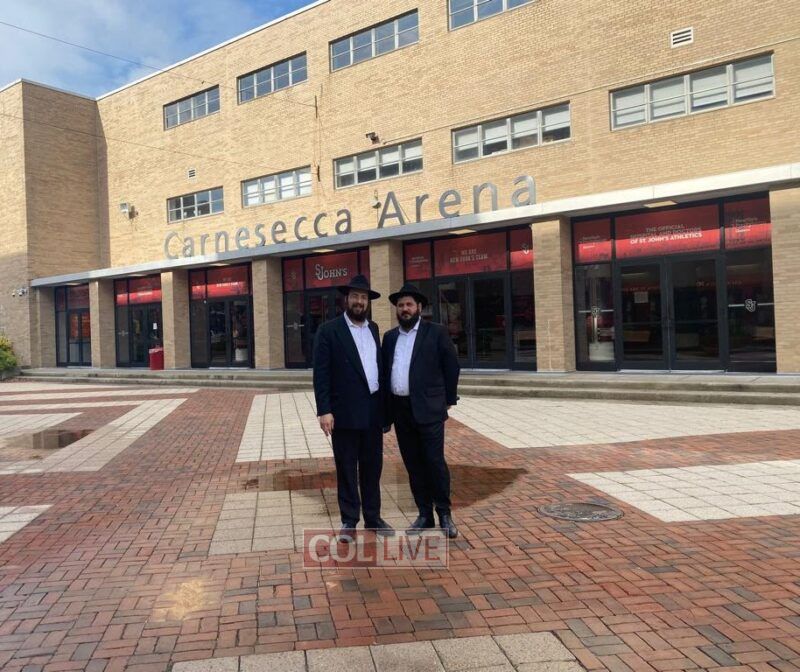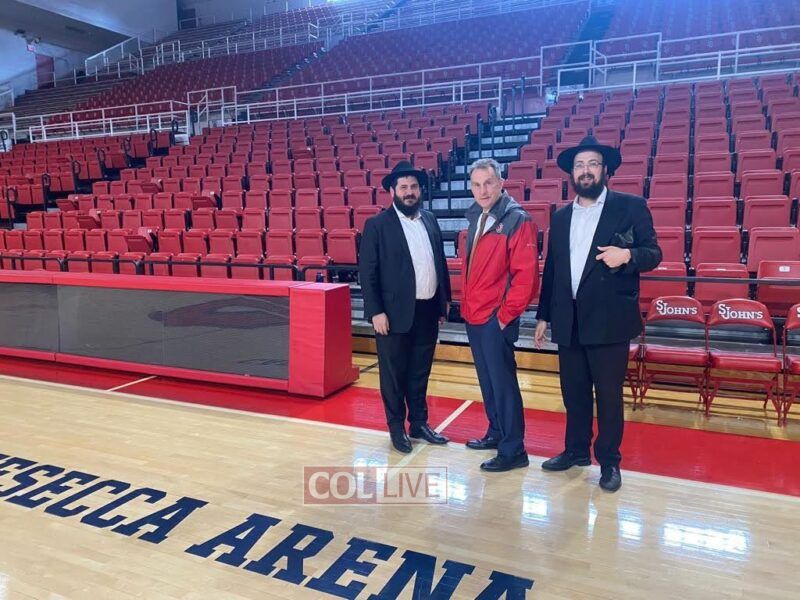With its vast red and white bleachers and convertible basketball court, the Carnesecca Arena fit the ticket. Plus, situated as it is just twenty minutes from the Ohel, which the teens will experience Sunday morning and early afternoon, the arena’s location could hardly have been better. Then, the trip to LaGuardia or John F. Kennedy Airports is a mere fifteen minutes.