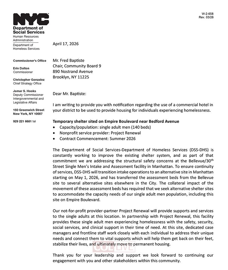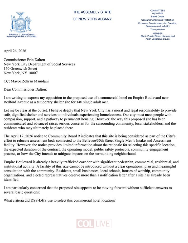 “Homeless New Yorkers deserve more than emergency placement in hotels, and communities deserve a transparent planning process,” Cunningham wrote, urging officials to reconsider the location.