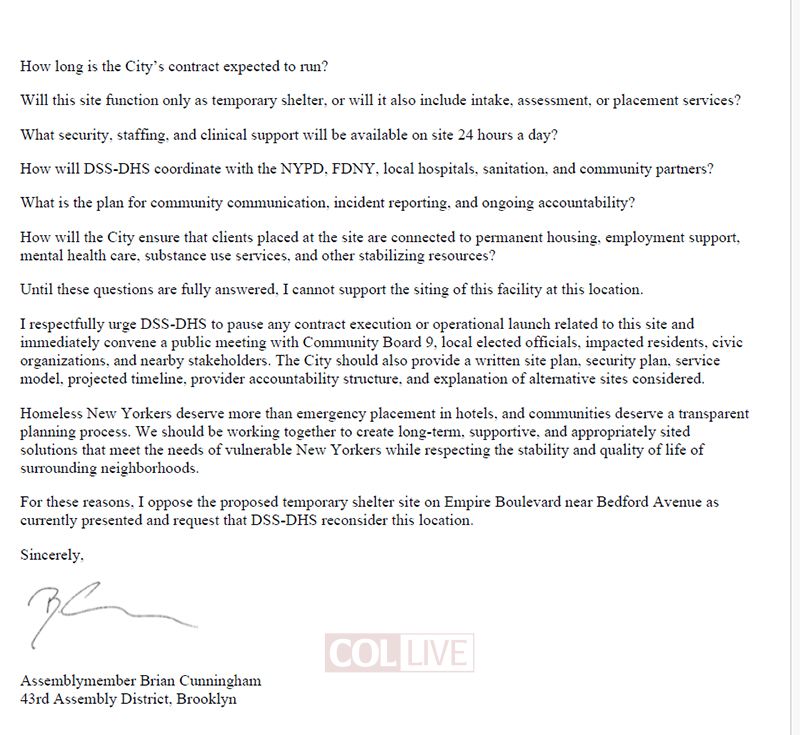 Assemblymember Brian A. Cunningham has come out in opposition to a newly proposed homeless shelter in Crown Heights, becoming the first elected official to publicly push back against the plan.