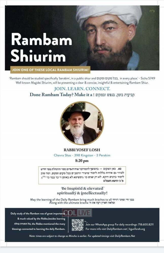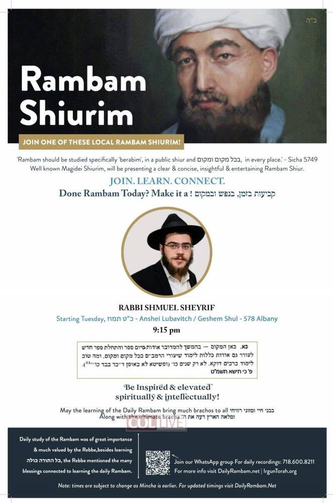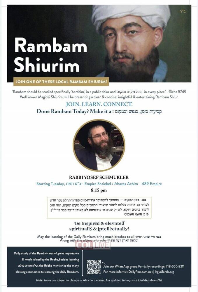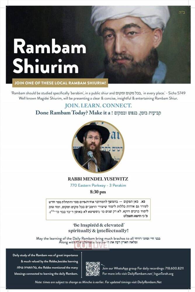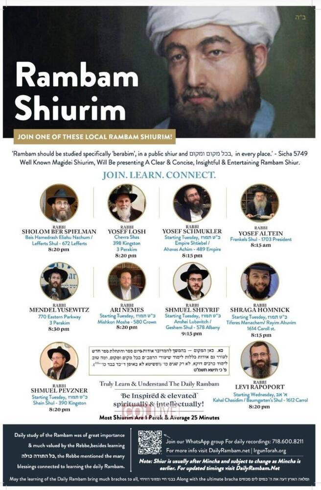 Irgun Torah has announced that there will be available for the local community in Crown Heights and as well online Rambam Shiurim from well known magidei shiurim, which have experience in teaching and also have the depth and knowledge to present a clear, insightful and entertaining Daily Rambam Shiur.