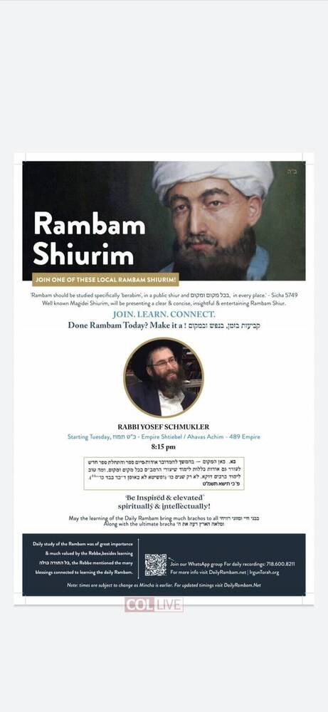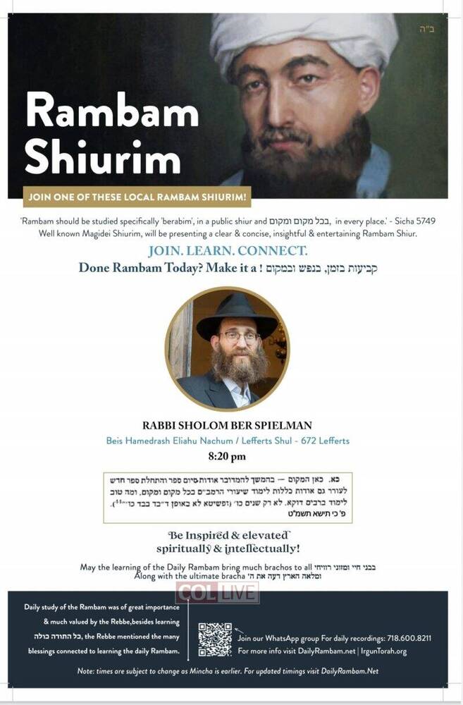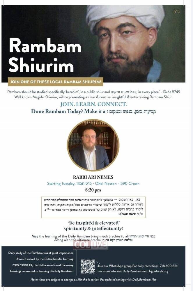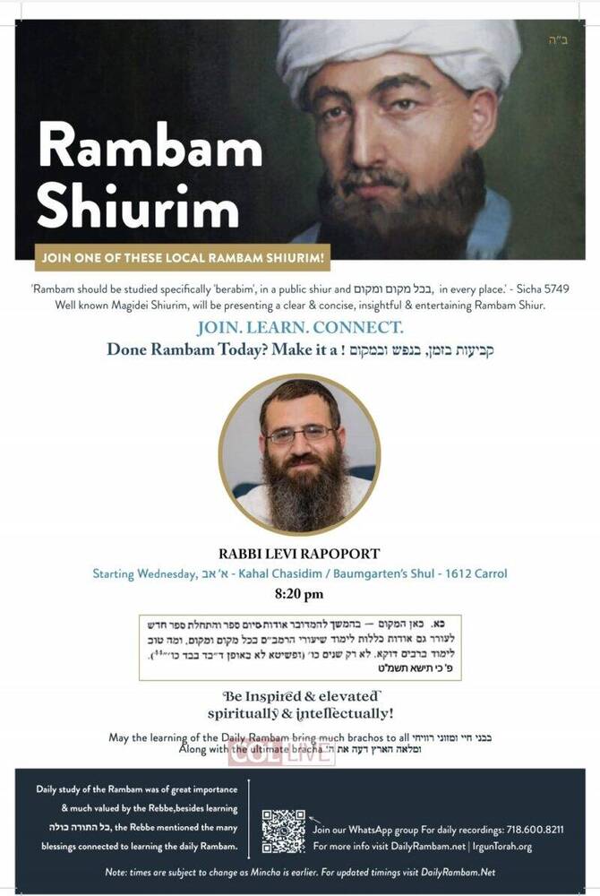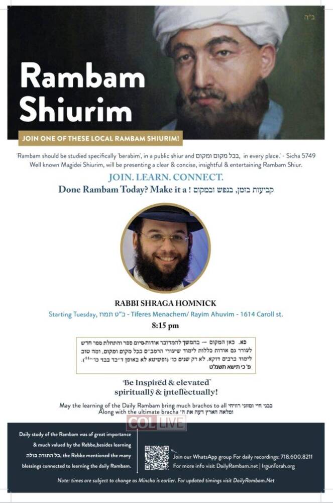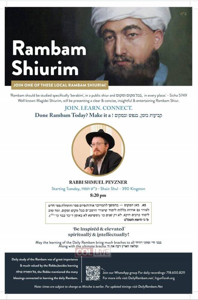 Irgun Torah has announced that there will be available for the local community in Crown Heights and as well online Rambam Shiurim from well known magidei shiurim, which have experience in teaching and also have the depth and knowledge to present a clear, insightful and entertaining Daily Rambam Shiur.