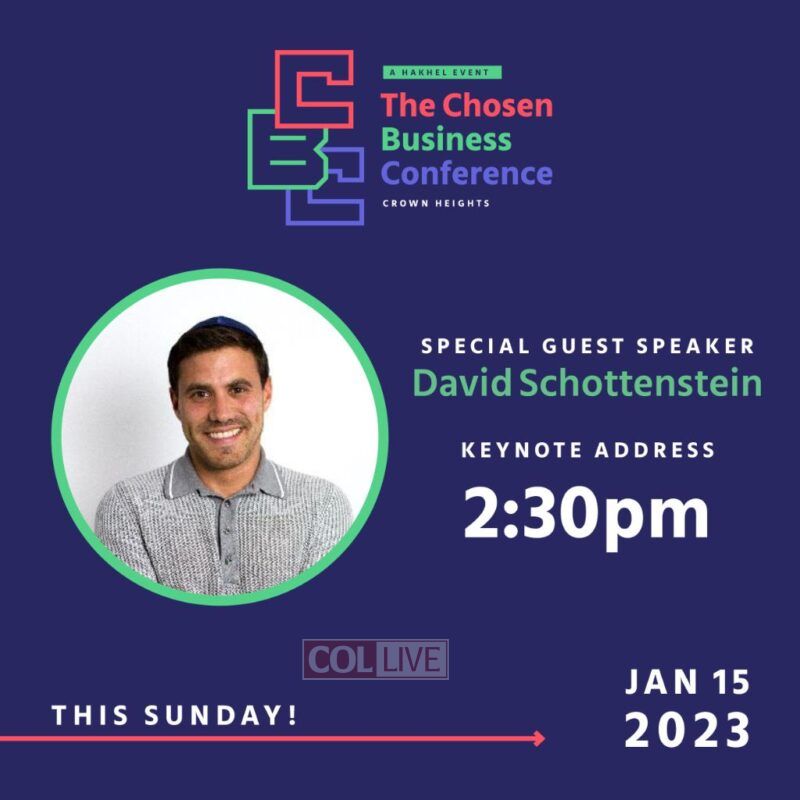 David Schottenstein will be speaking at the Chosen Business Conference, a shnas hakhel event hosted by Crown Heights Young Entrepreneurs (CHYE) at Beth Rivkah Rose Hall on January 15th from 2 pm to 6 pm. Registration is only $10.