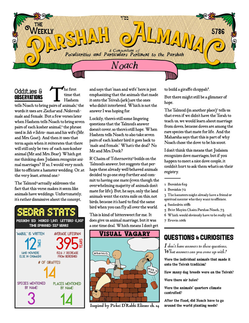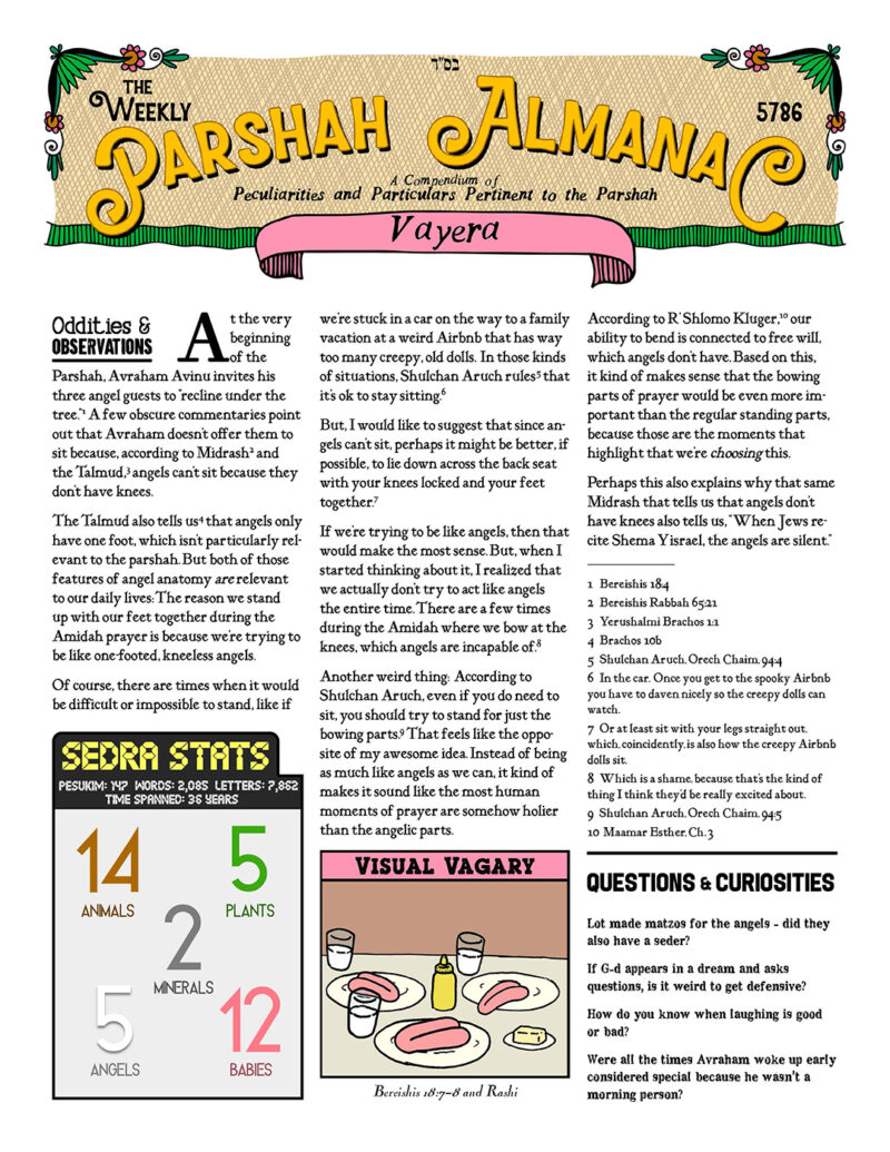 This week’s edition for Parshas Vayera includes a column about malachim not having knees, an exploration of every possible opinion in Torah sources on what happened to Lot’s wife, and an illustration inspired by the meal Avraham Avinu prepared for his guests. Each “Parshah Almanac” also includes a “Parshah Poll,” which shares reader responses to odd questions such as “which is your favorite malach?”
