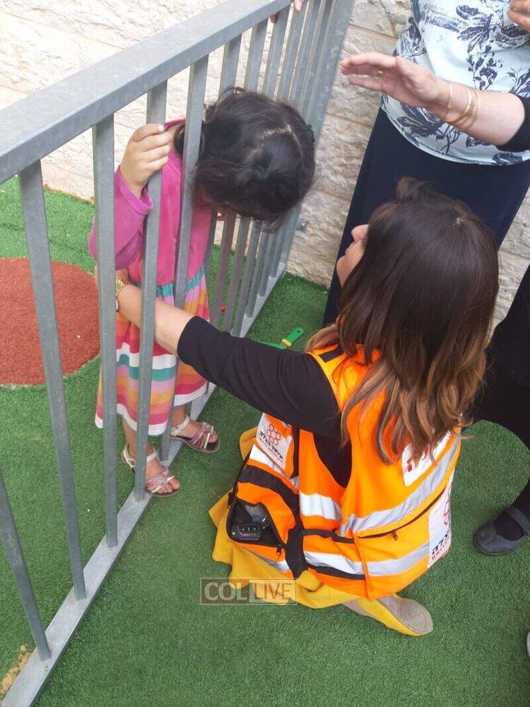 Reinkoff rushed over to the back of the playground, where the girl had gotten stuck. She calmed the girl down and checked to make sure that she wasn’t injured. She called the Fire Department who dispatched a squad. Before they arrived, Yanki Weinberg, the chapter head of United Hatzalah in the region arrived with another volunteer EMT from the organization. The duo applied a lubricant to the bars and then pulled on them in opposite directions while Reinkoff assisted the girl in passing fully through the bars where her head had gotten stuck.