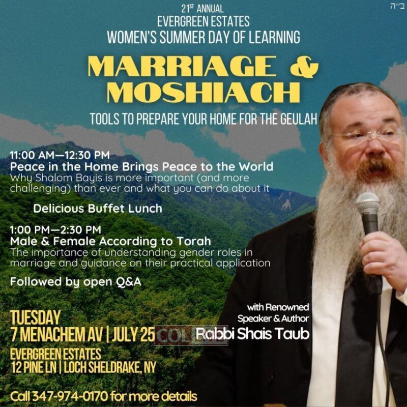 This year’s special topic is entitled “Marriage and Moshiach – Tools to Prepare Your Home for the Geulah” and will be delivered by renowned teacher and lecturer, Rabbi Shais Taub.