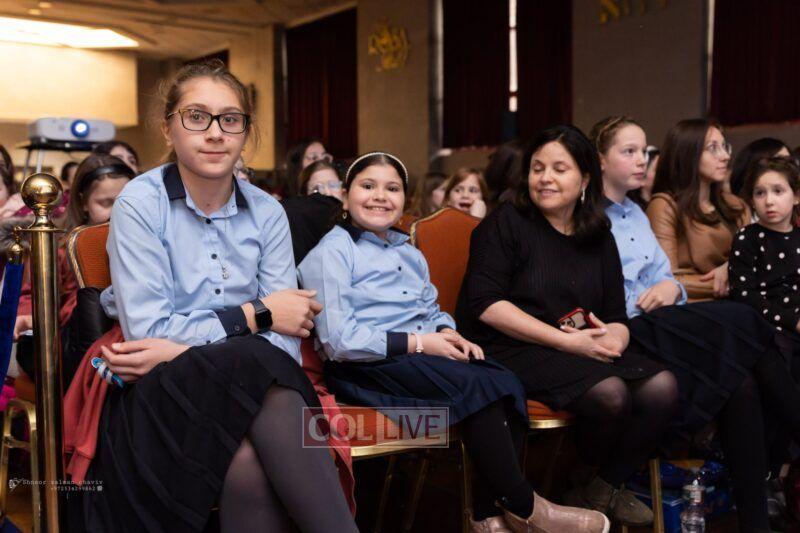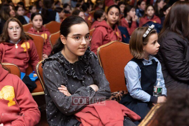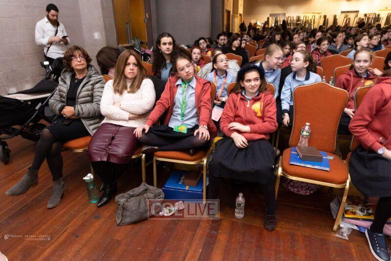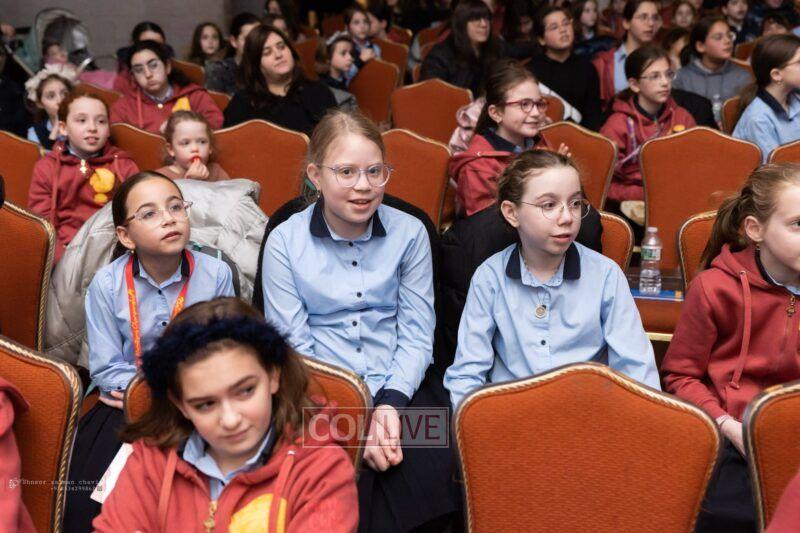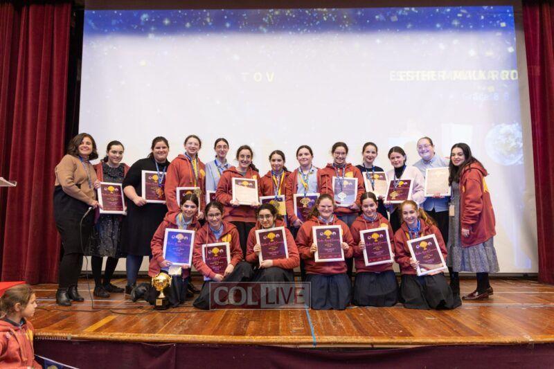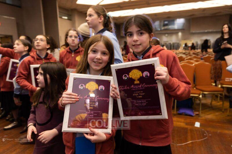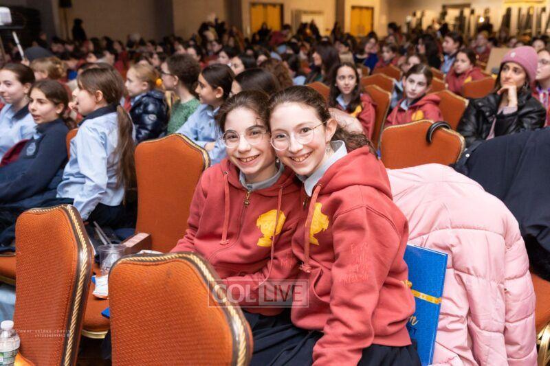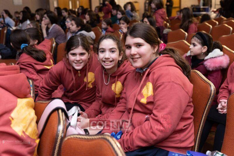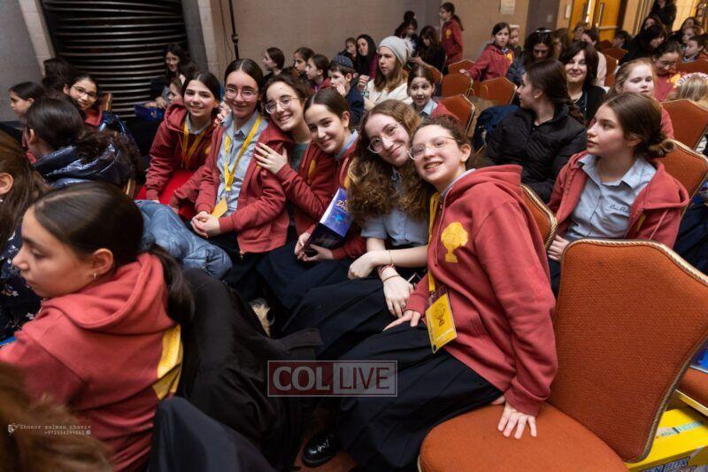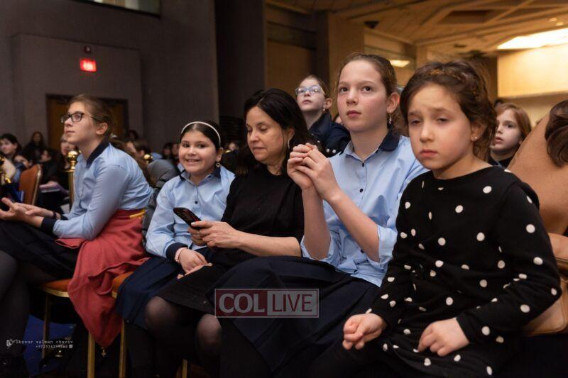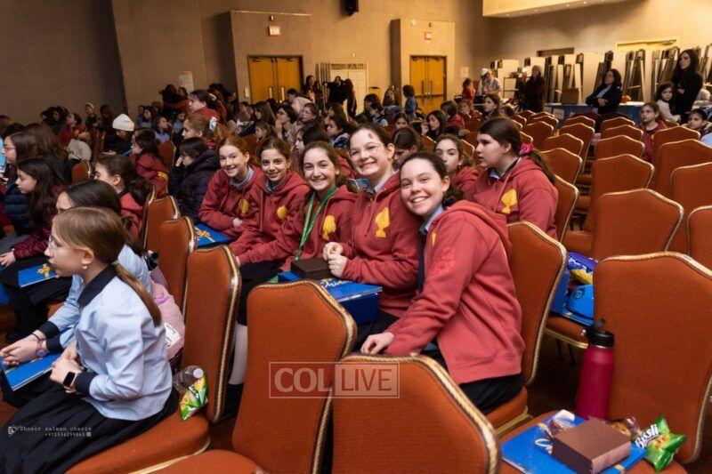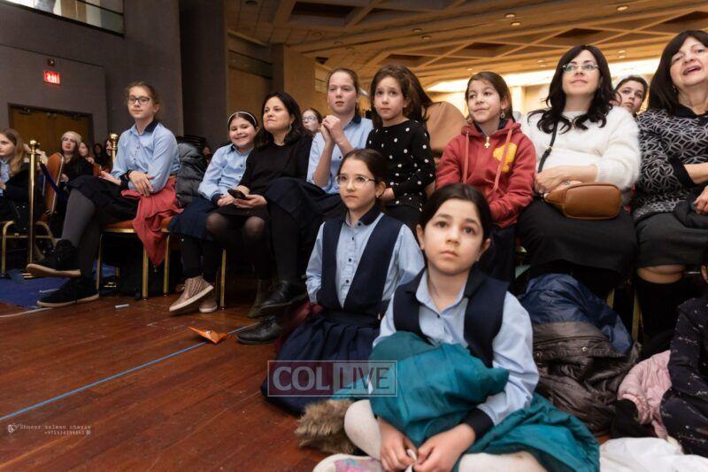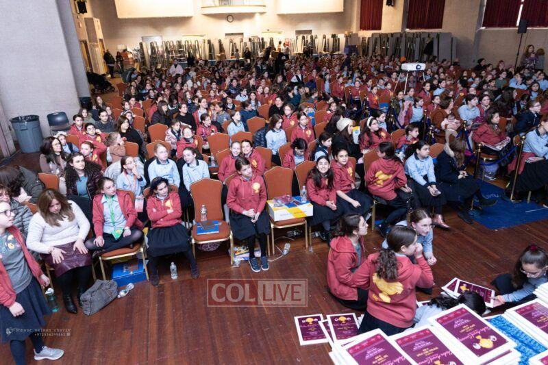 Hundreds of students from Bais Rivkah in Crown Heights gathered in the Rosa Hall for a viewing of the Chidon finale, followed by a trophy and award ceremony for the participants and their proud parents.