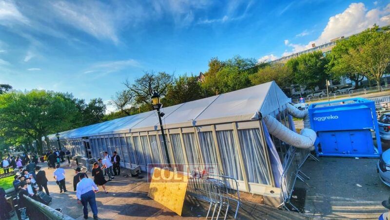 Spanning 250 feet, the fully air-conditioned tent serves as an expansion for the overflow crowd during Tishrei. With 60 daily Minyanim, a place of Davening and learning has been created.