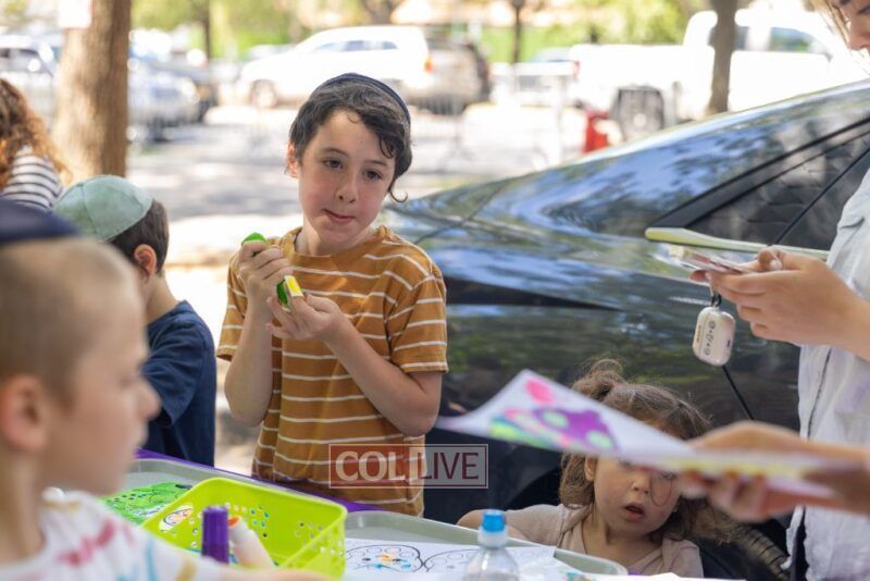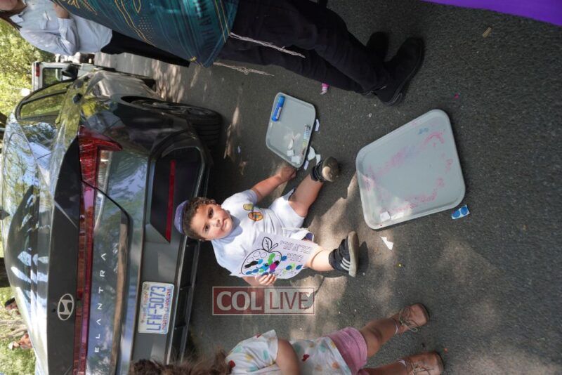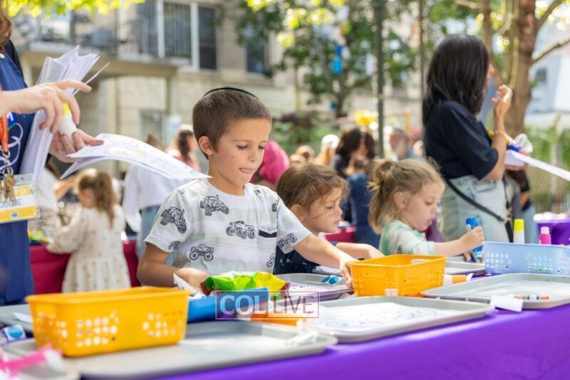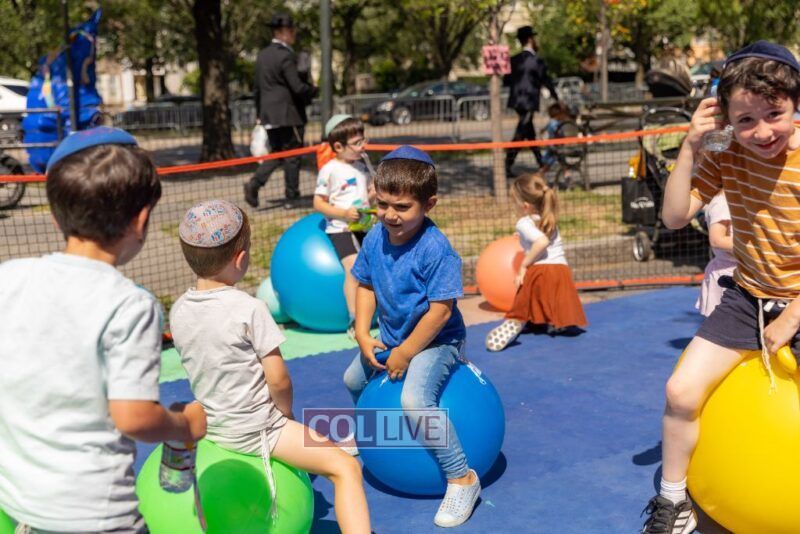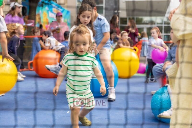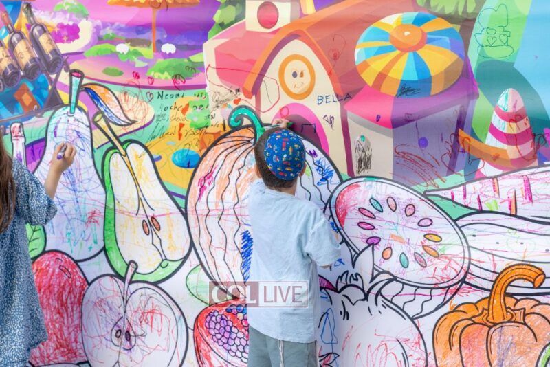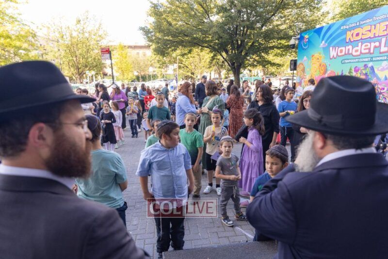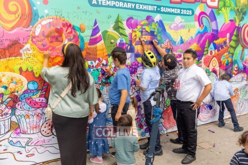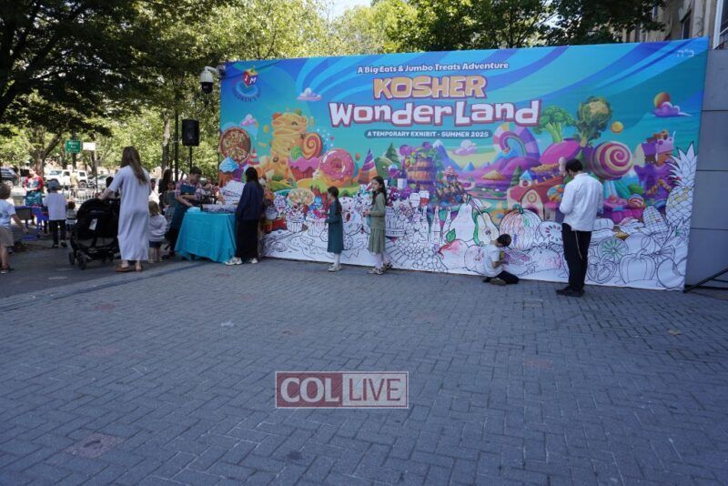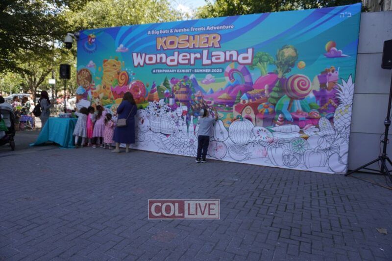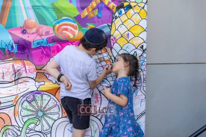 We zoomed past kids bouncing on giant balls boing, boing! and we giggled when they tried to catch us mid-air. (Spoiler: no one can hold onto us for long!) We floated over to the Kosher Wonderland Wall and wow! we watched it come alive with colors, markers, and crayons until it looked like a giant rainbow mural.