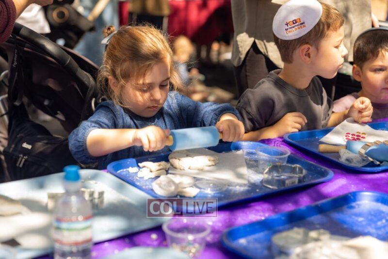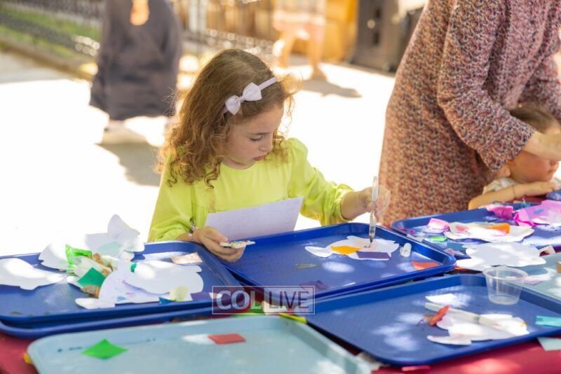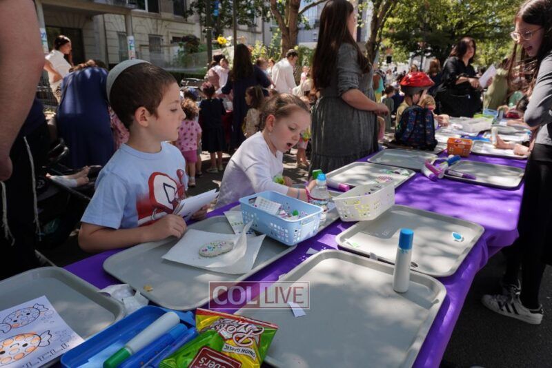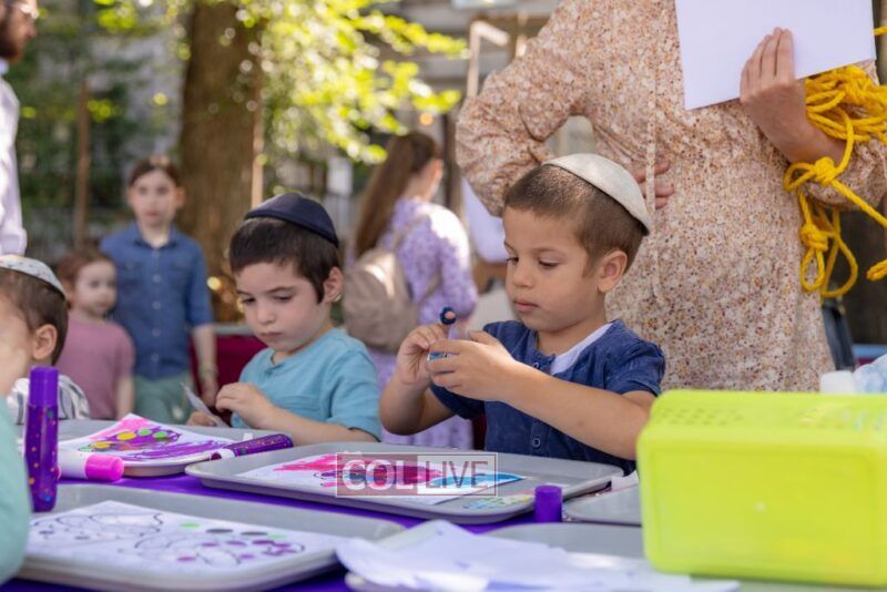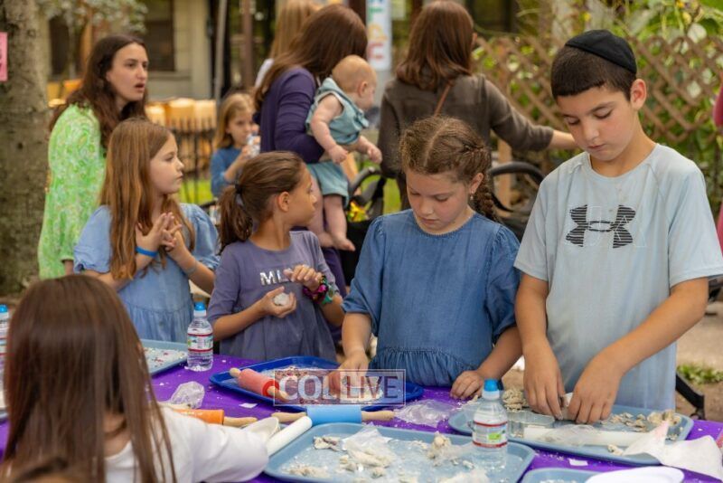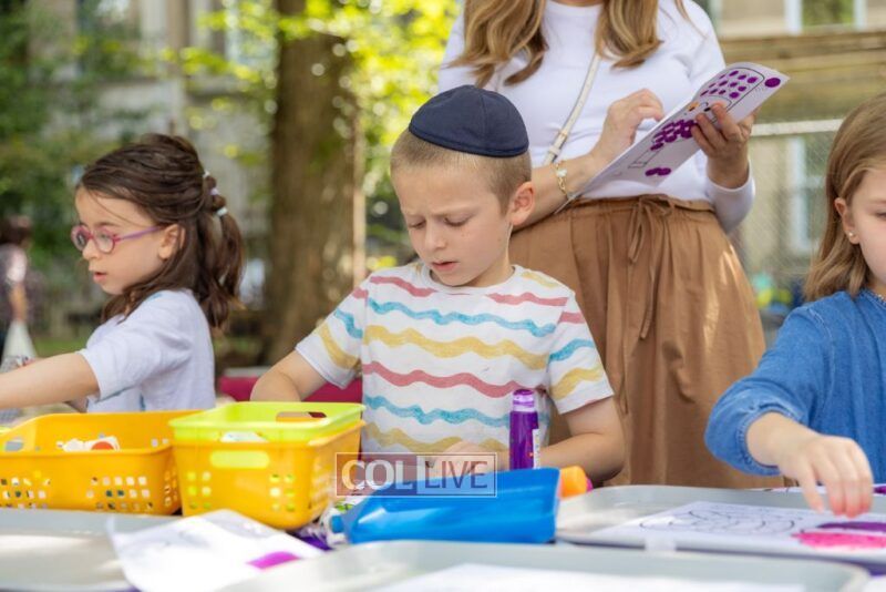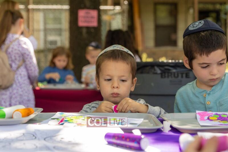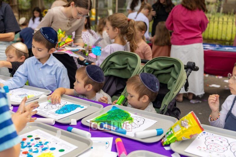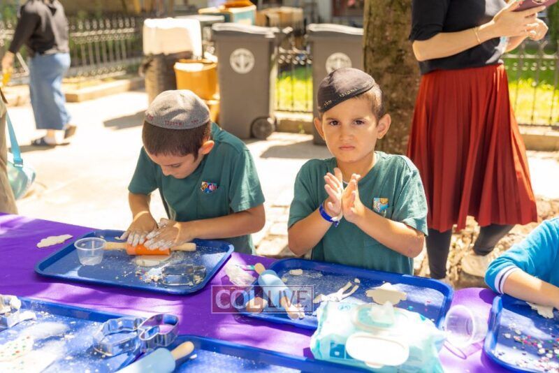 Drifting lower, we peeked at sparkly clay food sprinkled with gems (so shiny, we almost thought we were looking in a mirror). We bounced past dot markers and stickers decorating the brachos food groups, oh, the concentration on those little faces! Then we got pulled into the Bubble Sensory Station where kids made more of… well, us! Circles, squares, even bubble chains. It felt like we were at a family reunion!