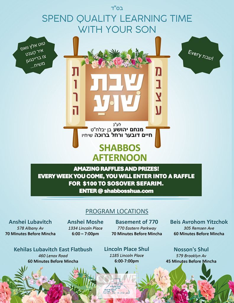 “Shabbos Shua” is a new and innovative program in our שכונה, giving fathers the opportunity to partner with their sons and experience the מתיקות of תורתנו הקדושה together.