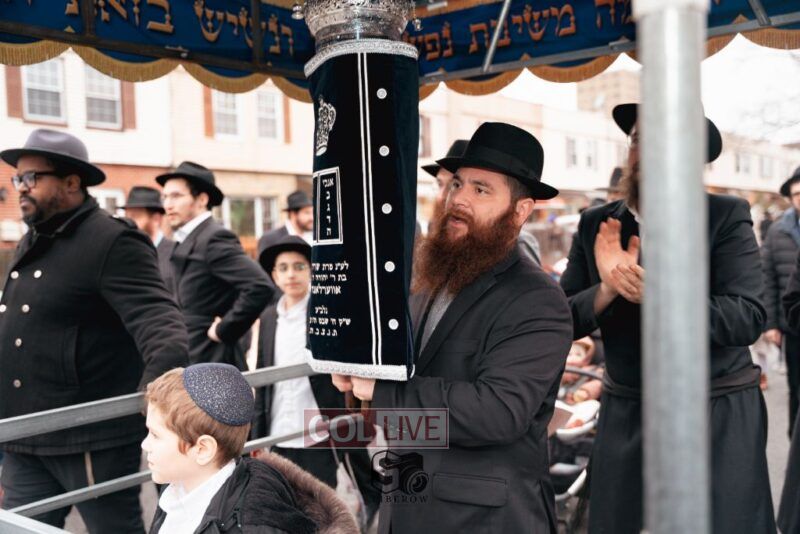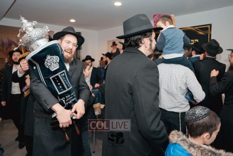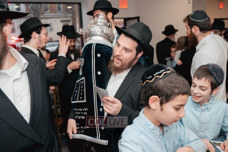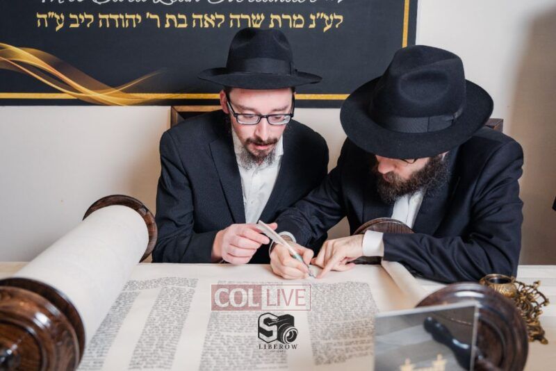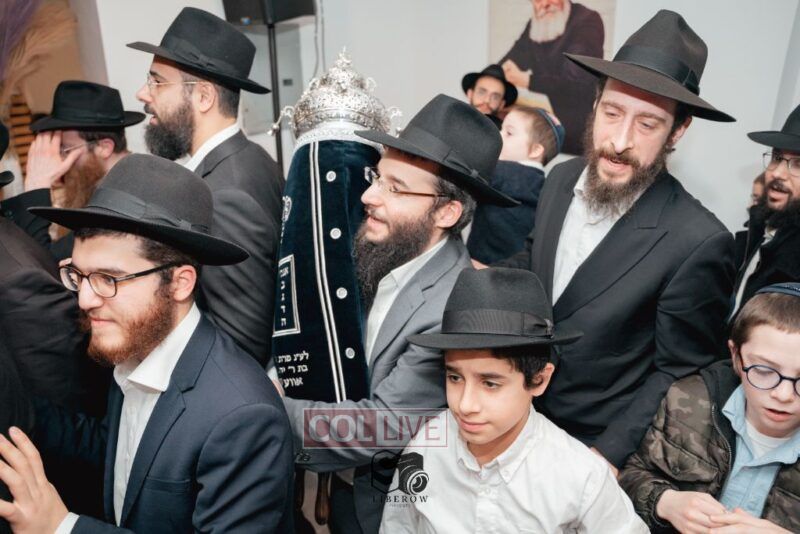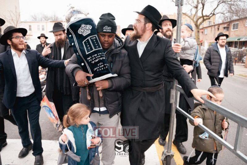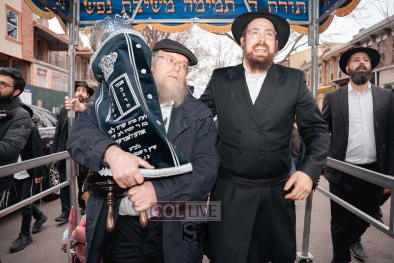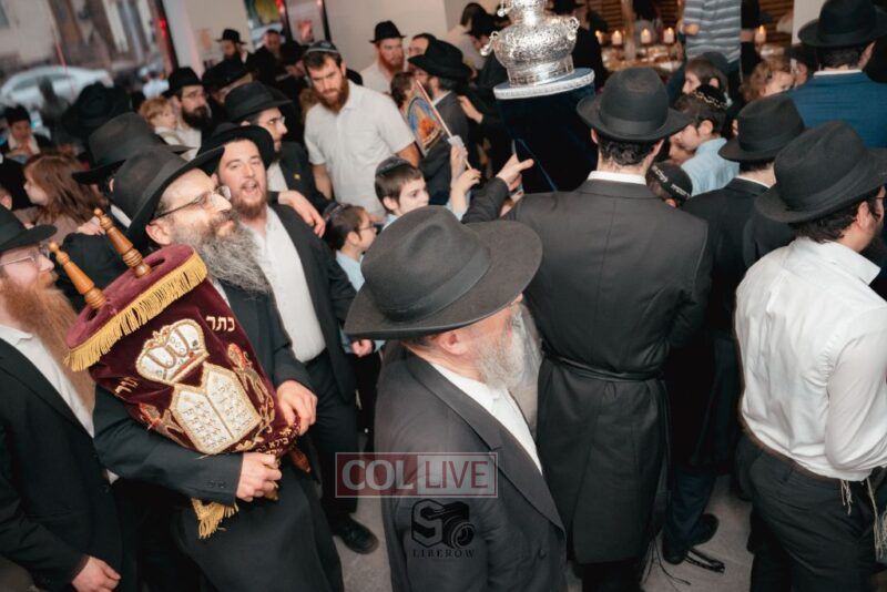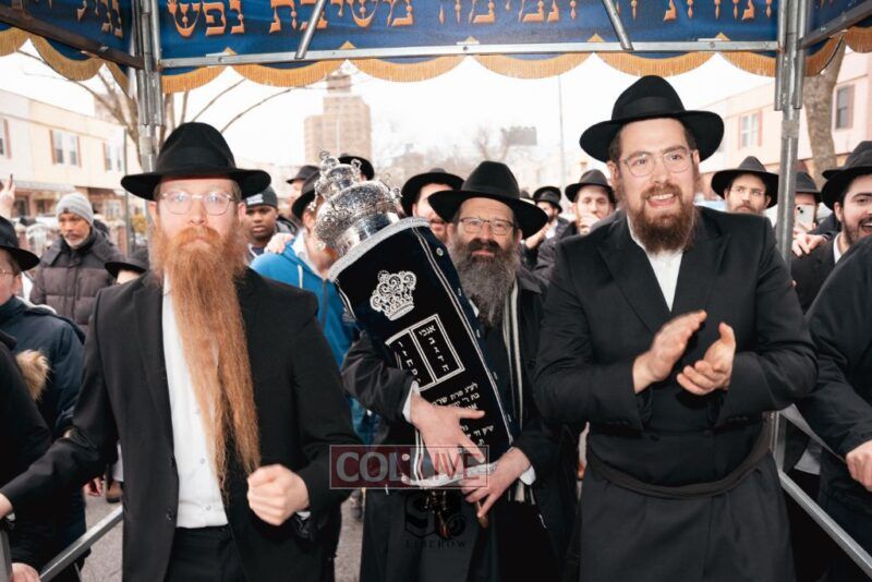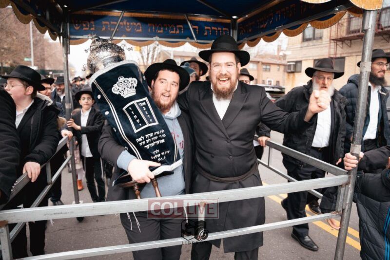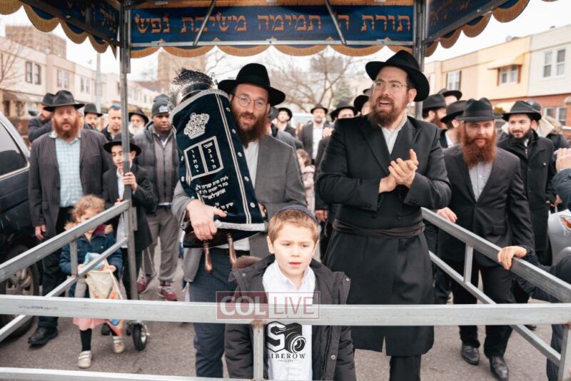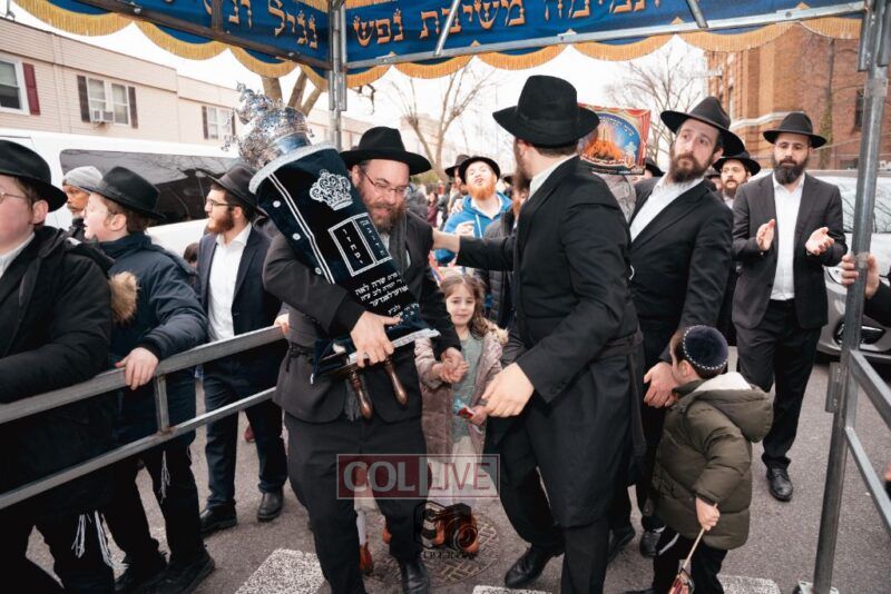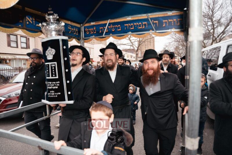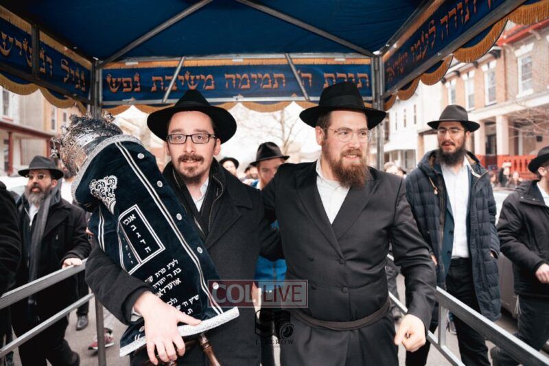 The writing of the final letters took place at 84 Amboy St, Brooklyn NY, followed by a procession to 125 Dumont Ave, for dancing and hakafos.