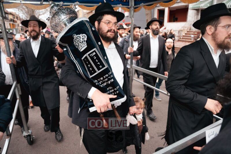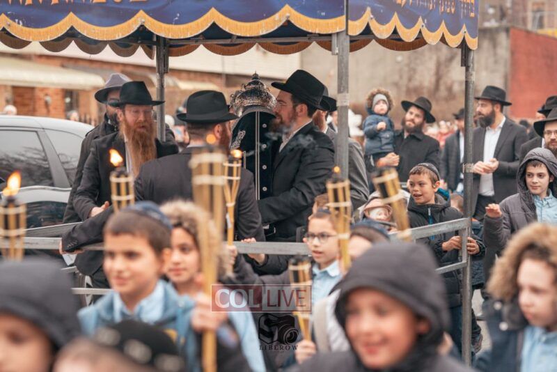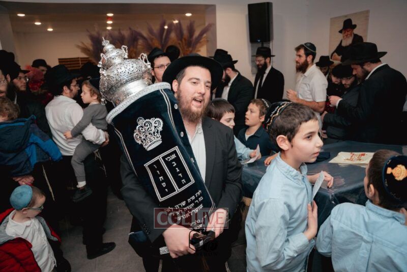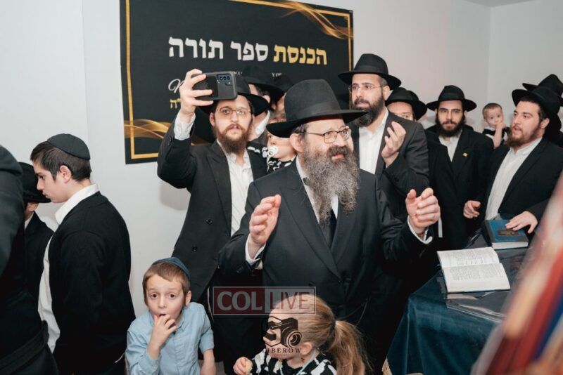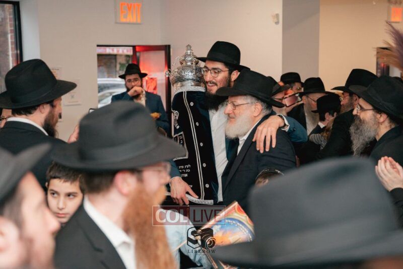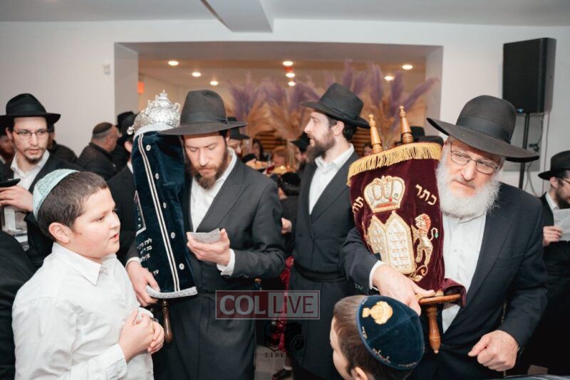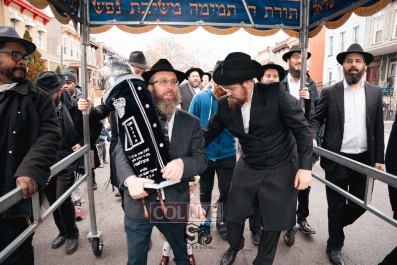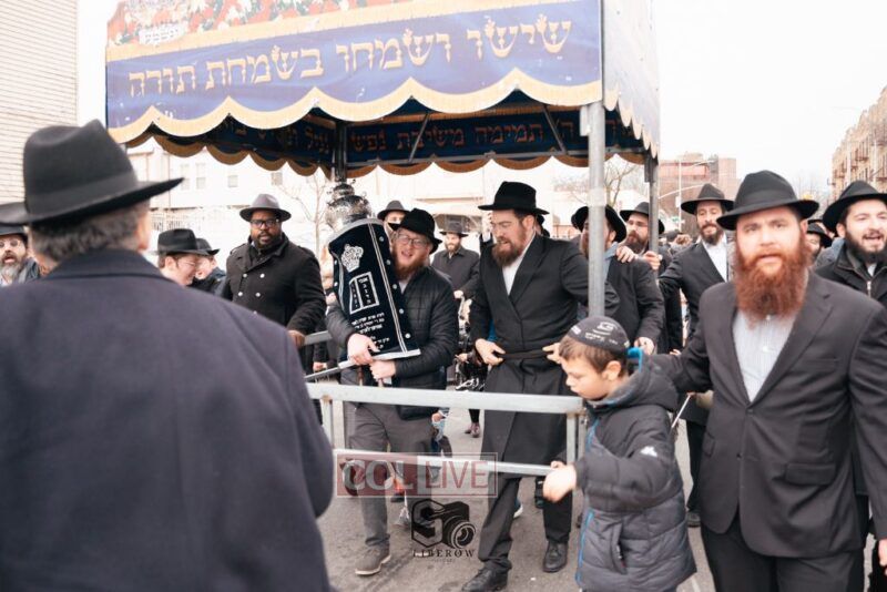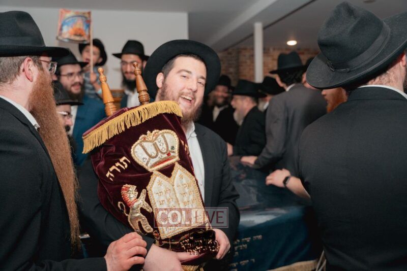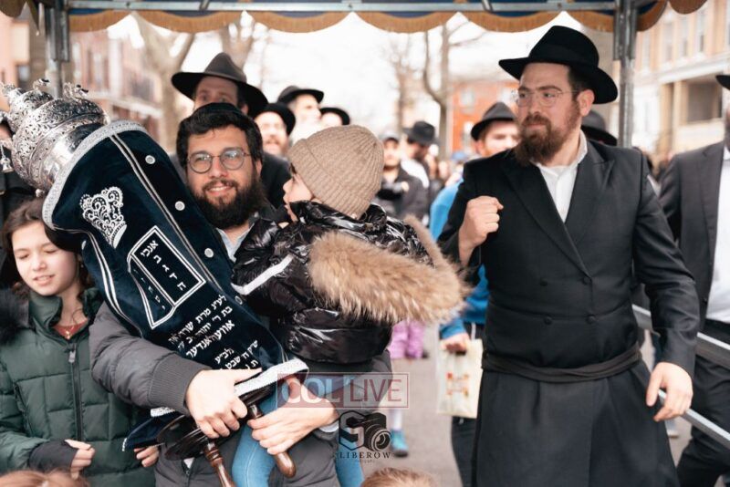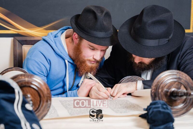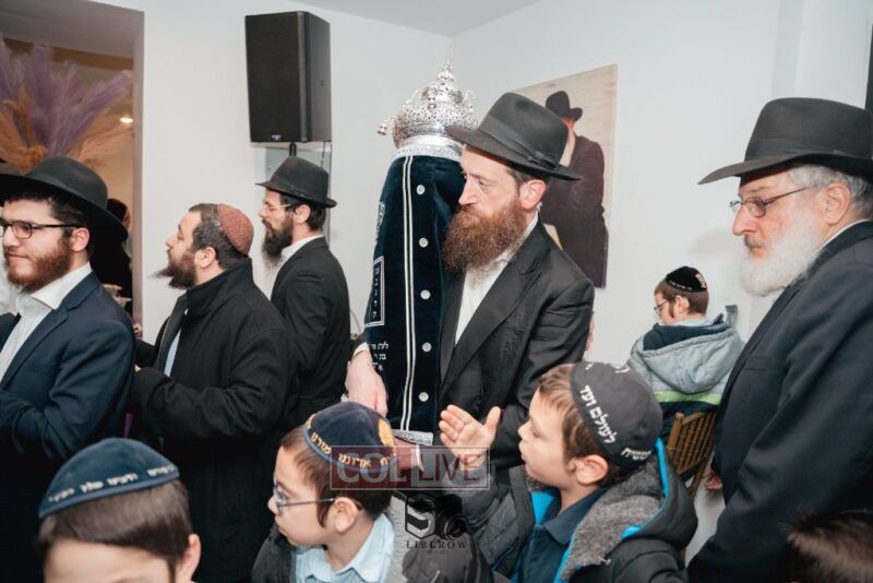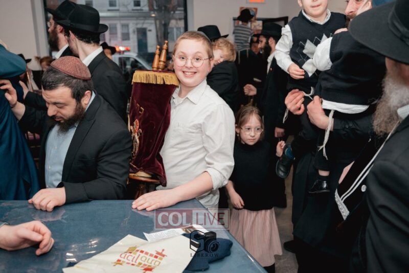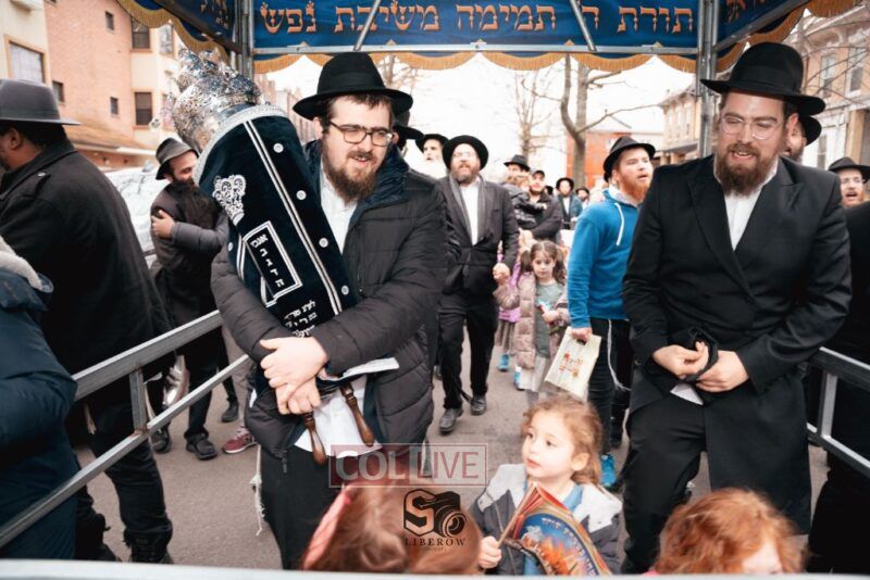 The writing of the final letters took place at 84 Amboy St, Brooklyn NY, followed by a procession to 125 Dumont Ave, for dancing and hakafos.