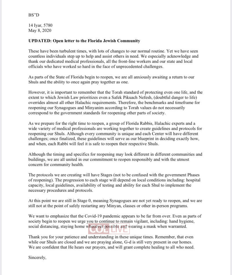I know personally that some of the rabbis on the list did not know that their names were on that letter. COL, please fact check thing before you post them! My community had minyanim this shabbos, everyone was very careful, and yidden got to hear krias hatorah for the first time in many weeks.