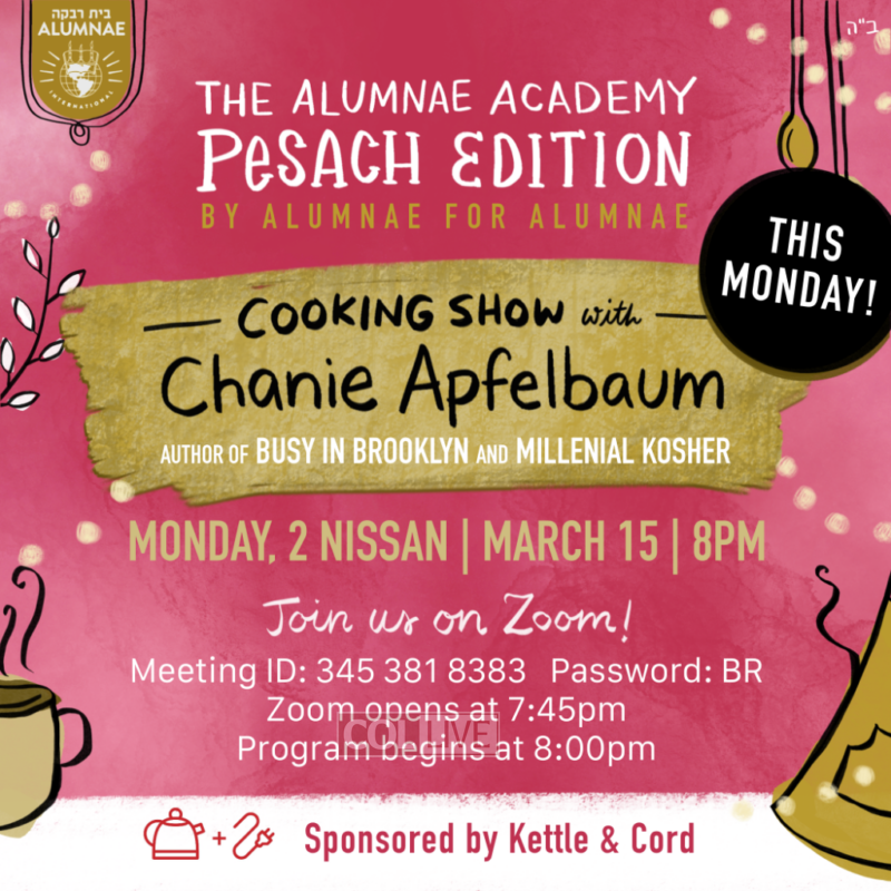 Then, we’ll get more practical with a Pesach cooking demo with Mrs. Chanie Apfelbaum, author of a popular blog and cookbook. Learn Chanie’s tips and tricks for a unique and delicious spin on Pesach cooking.