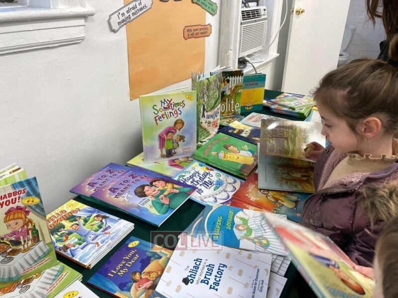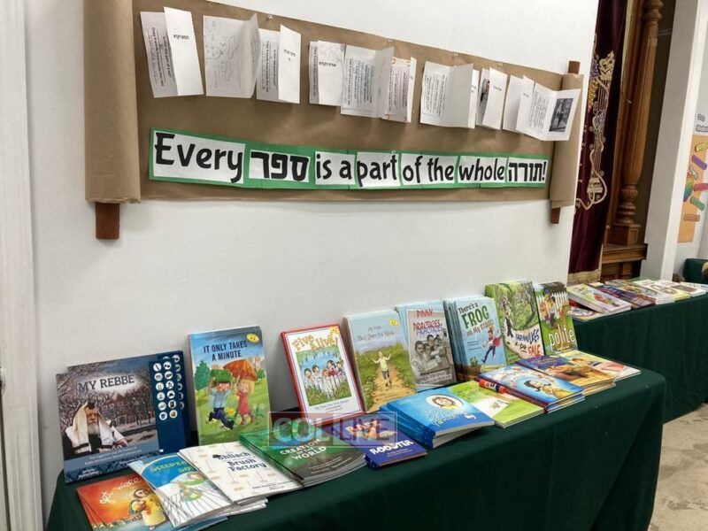 Each class had the opportunity to visit the Hey Teves fair throughout the day to admire the students’ hard work. During their visit, they heard a story from school director Mrs. Esther Betesh and enjoyed a “Sefer” shaped cookie. Students had fun taking photos with the giant Sefer and perused the books on display.