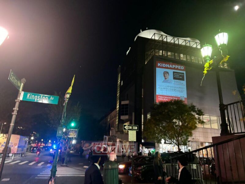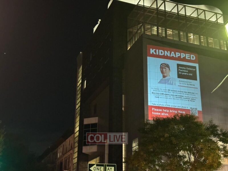The now famous red and white ‘Kidnapped’ signs, bringing attention to the the plight of 222 hostages kidnapped by Hamas in the recent massacre on Simchas Torah, are being projected onto the side of the Jewish Children’s Museum in Crown Heights.