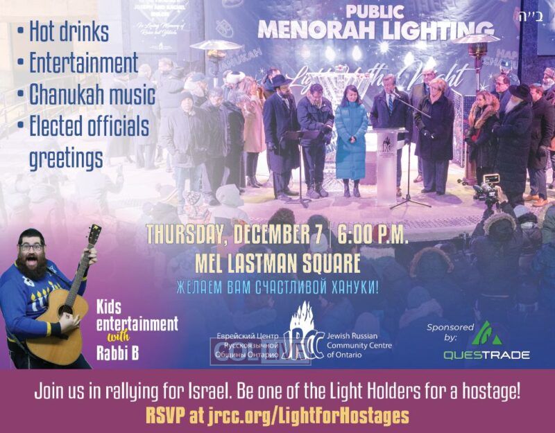 The Jewish Russian Community Centre of Ontario (JRCC) will host the GTA’s central Chanukah celebration with the lighting of a giant Menorah built entirely out of Lego at Mel Lastman Square, 5100 Yonge Street, on Thursday, December 7 at 6 PM, the first night of the eight-day holiday.