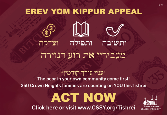 Rosh Hashana, 5738 at a farbrengen the Rebbe spoke about the mitzvah of Ma’os Chittim, pointing out that the needs of the poor during Tishrei are even greater than during Nissan. He suggested that a fund be established supplying Shabbos and Yom Tov necessities to the needy. Shimshon and Martha Stock OBM answered the Rebbe’s call. For over 40 years, CSSY has continuously been feeding the poor and needy and providing them with Simchas Shabbos & Yom Tov during Tishrei and throughout the year.