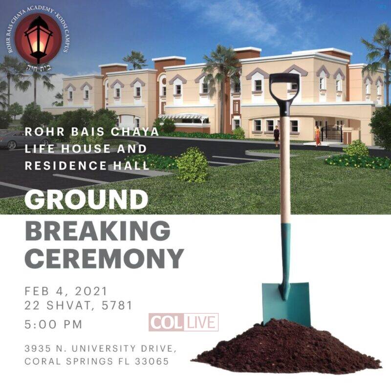 Rohr Bais Chaya Academy in Tamarac, Florida, marked the yartziet of its namesake Rebbetzin Chaya Mushka Schneerson OBM with a groundbreaking ceremony for the addition of a new building, named the Life House and Residence Hall.
