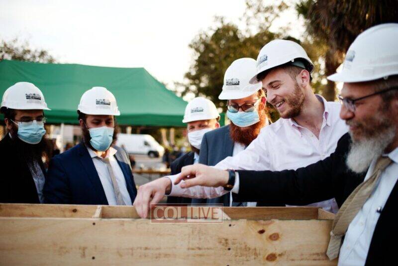 In a beautiful expression of unity, the local Shluchim, Rabbi Yankie Denburg, Rabbi Shlomie Denburg, Rabbi Yossi Hodakov, Rabbi Avraham Granat, Rabbi Moshe Wolf and Rabbi Zevi Schusterman placed a stone together with Rabbi Moshe Rabin, Executive Director of Rohr Bais Chaya Academy. The final stone was placed by Menachem Rabin, CEO of the SwiftBuying Group.