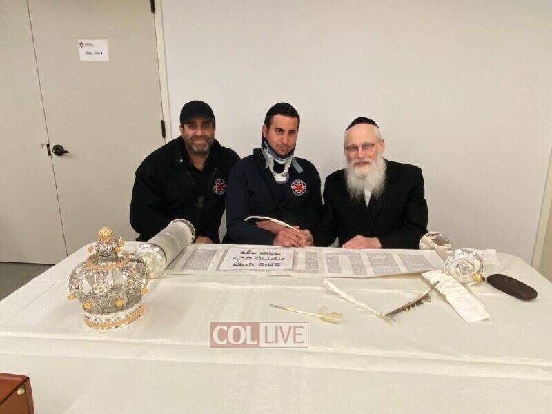 The volunteers are filling in the final letters of the Torah which is being written by Crown Heights Sofer Rabbi Moshe Klein in honor of Hatzalah members around the world.