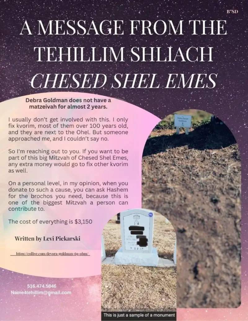 Levi Piekarski from Crown Heights, an activist who raises funds to restore old Kvorim and gravestones near the Ohel, says he was recently informed that Devora Goldman’s grave does not have a stone, nearly 2 years after her passing.