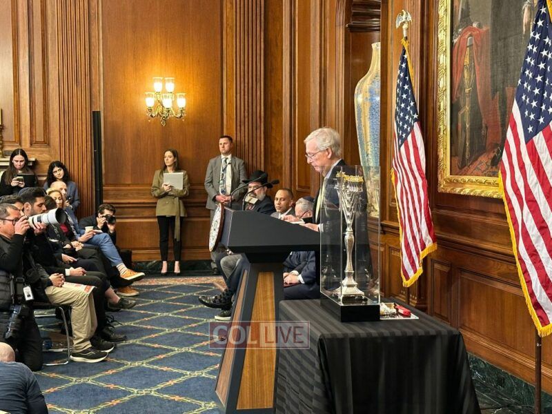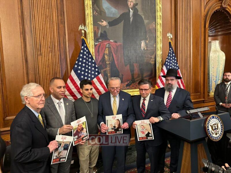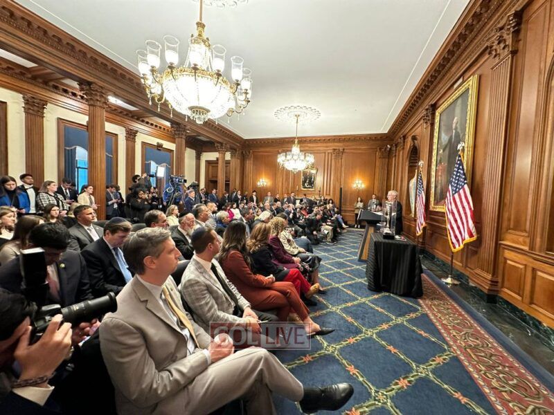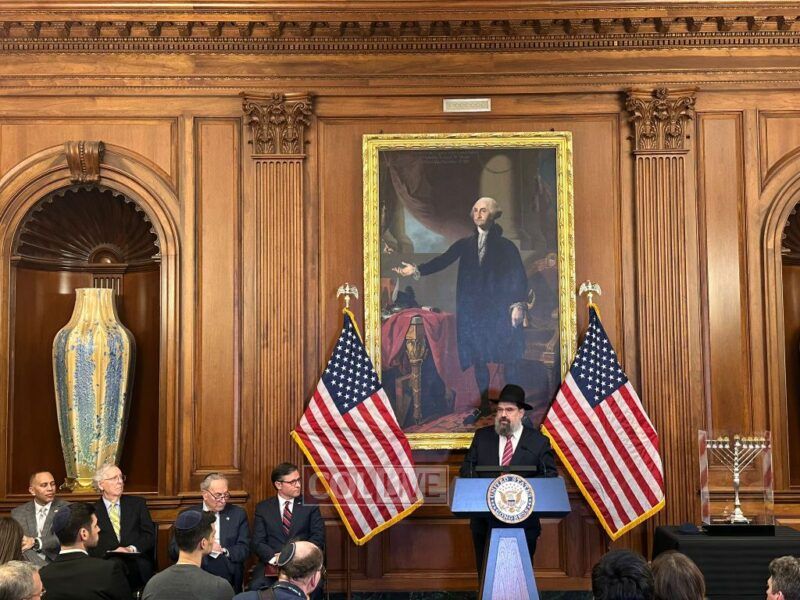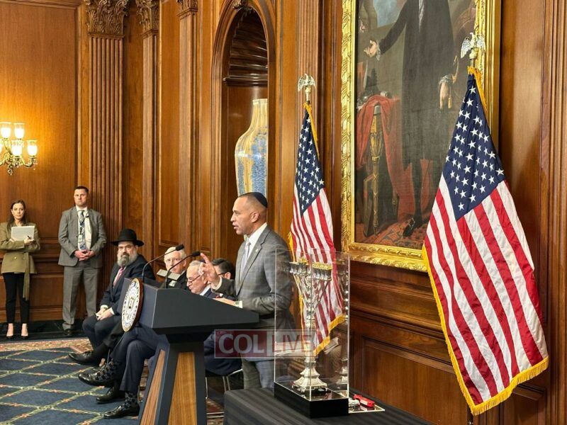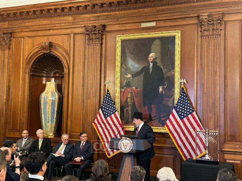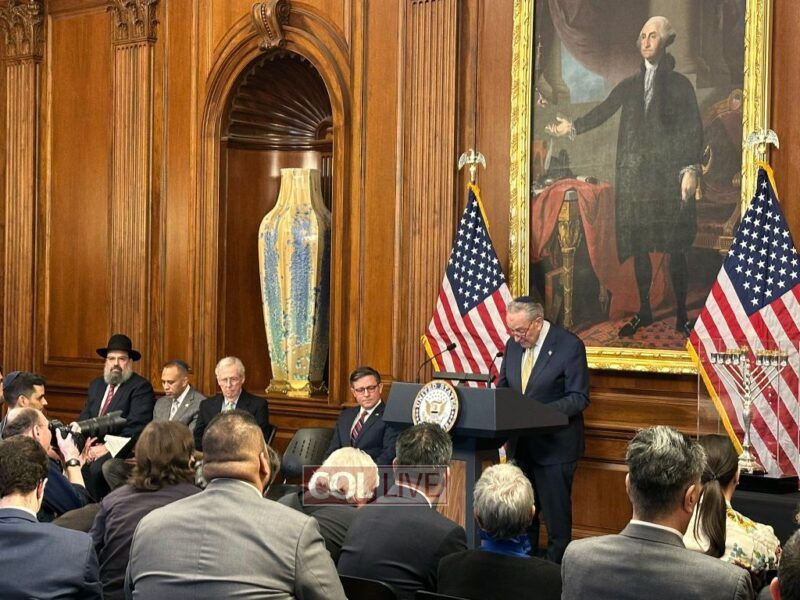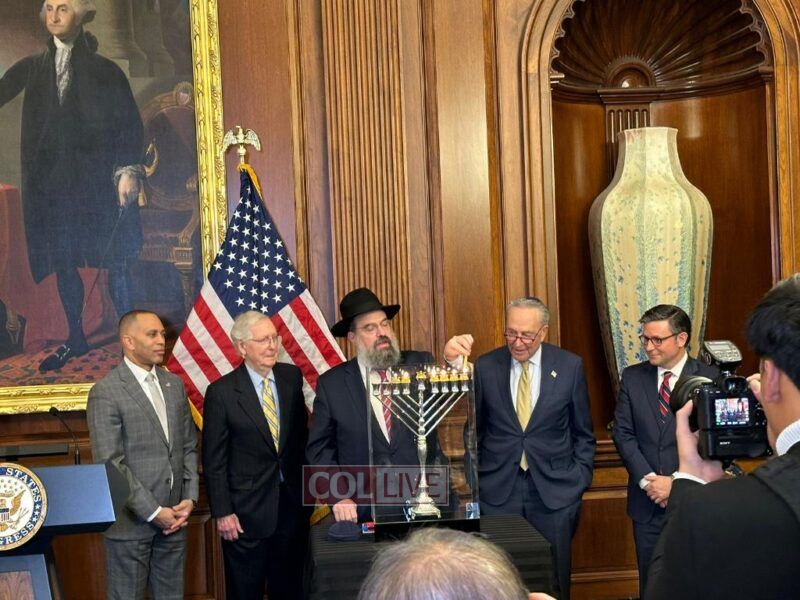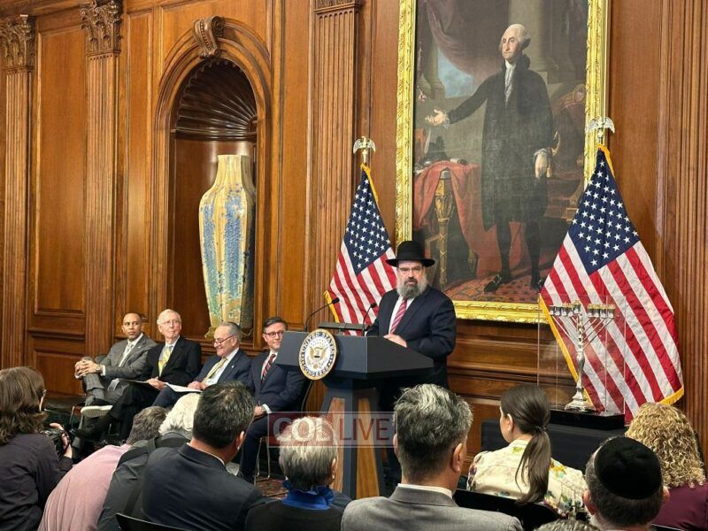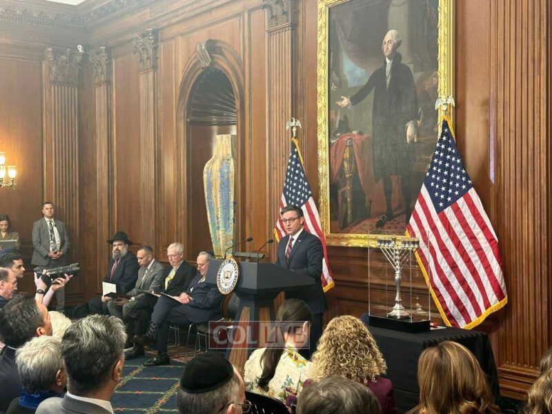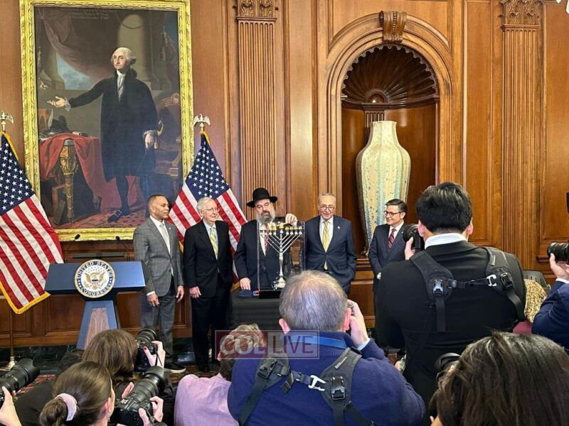 Leaders of the House – Speaker Mike Johnson, R-LA, and Leader Hakeem Jeffries, D-NY and Senate Majority Leader – Chuck Schumer D-NY and Republican Leader Mitch McConnell, R-KY joined Rabbi Levi Shemtov, Executive Vice President of American Friends of Lubavitch (Chabad) and founder of the Capitol Jewish Forum, and dozens of Members of Congress and a small number of invited Jewish leaders and guests, for a special Capitol Menorah Lighting in the Rayburn Room, just steps from the House Floor.