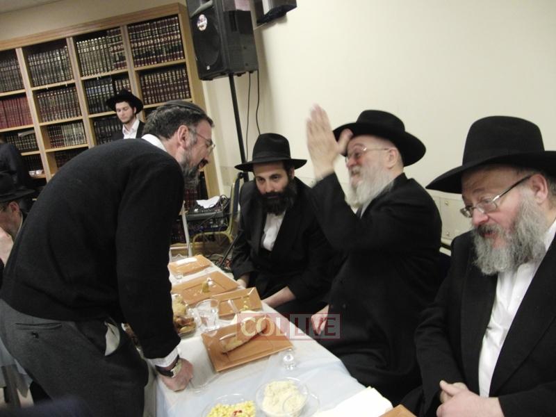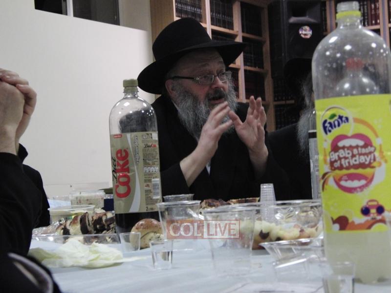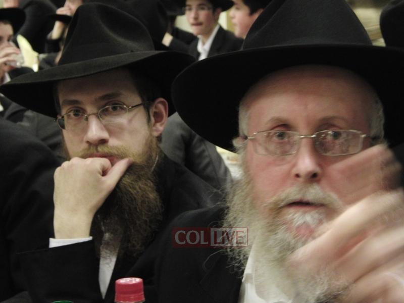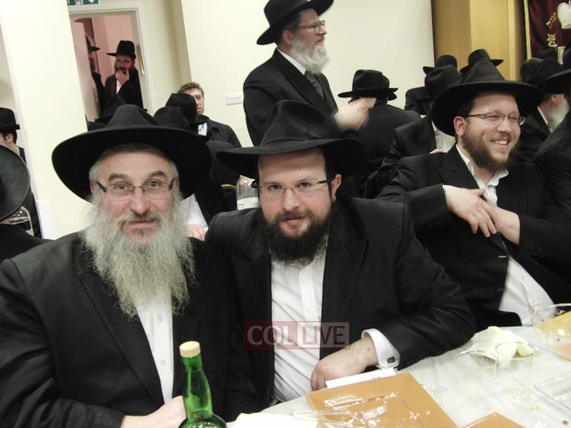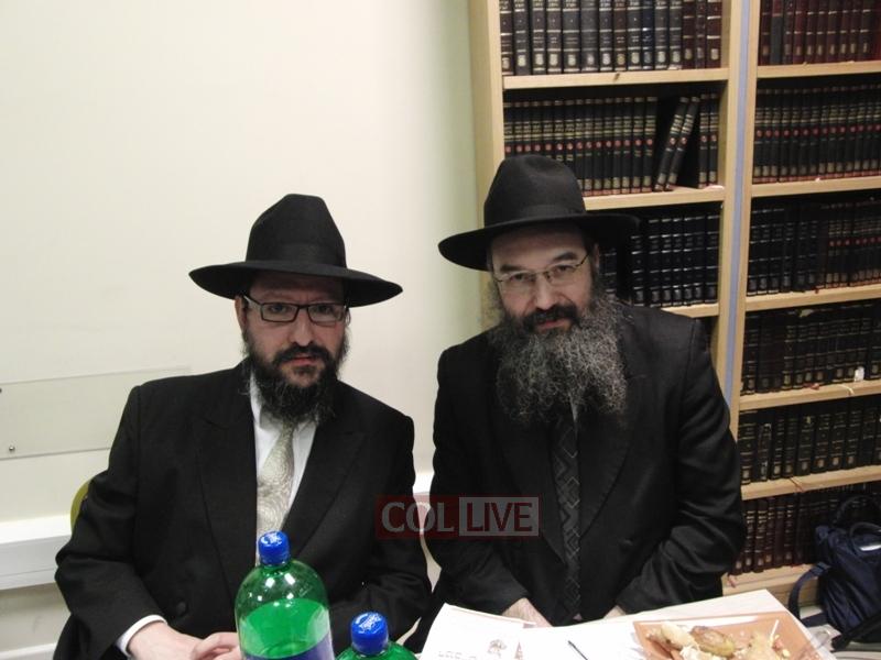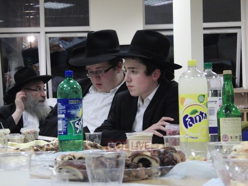 After the Siyum, Bochurim, Anash, and Shluchim sat down for a Farbrengen with Rabbi Touger, who was joined by Rabbi Yosef Yitzchok Wilschansky, Rosh Yeshiva in Tzfas, who came to London for a Simcha.