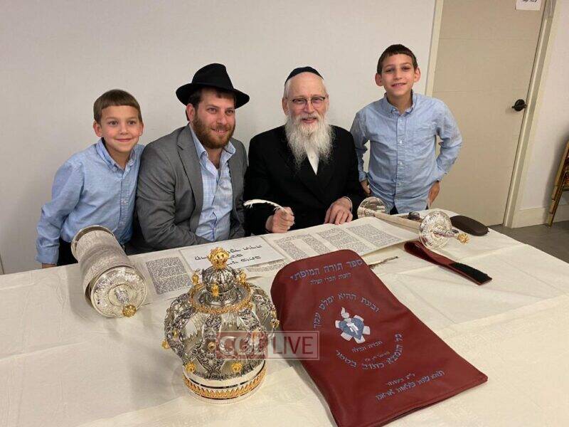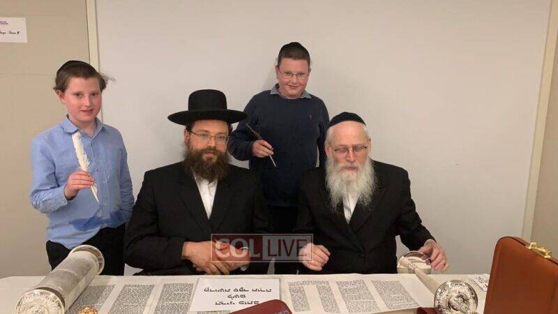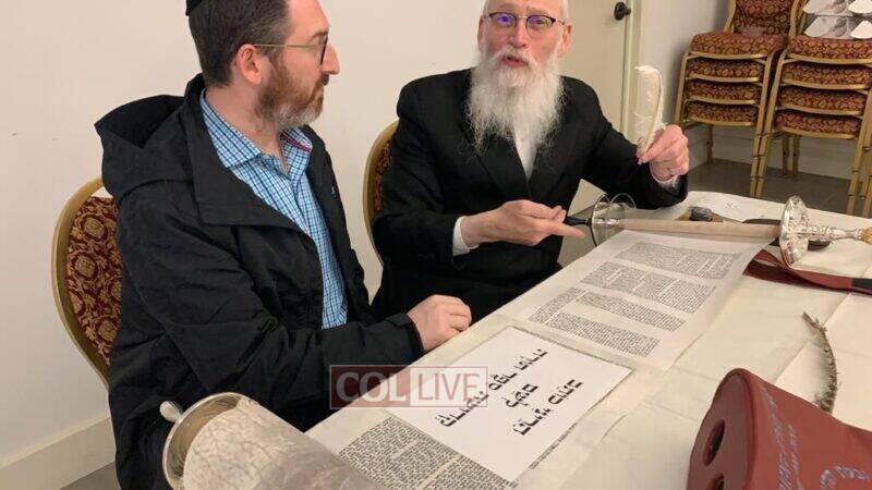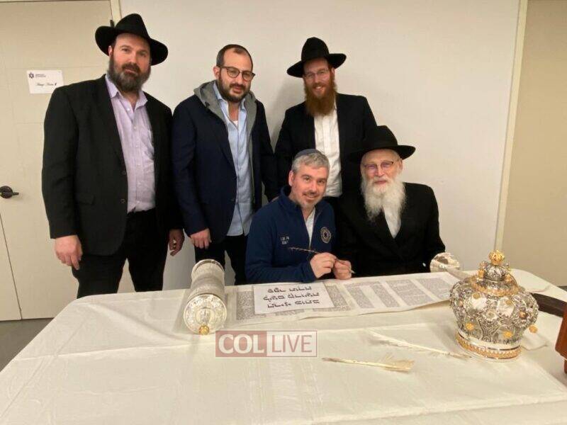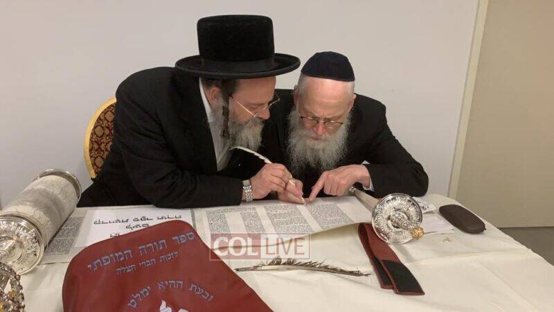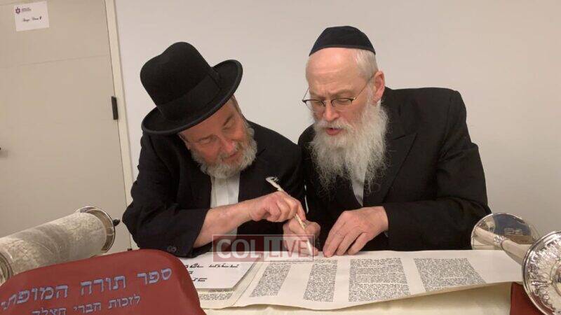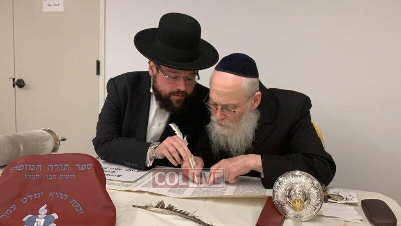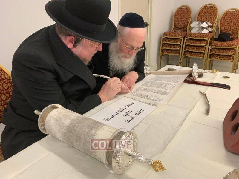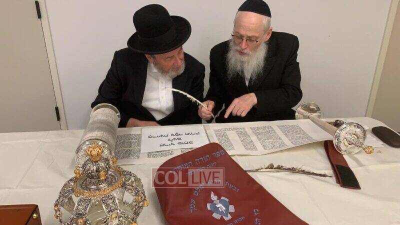 The volunteers are filling in the final letters of the Torah which is being written by Crown Heights Sofer Rabbi Moshe Klein in honor of Hatzalah members around the world.